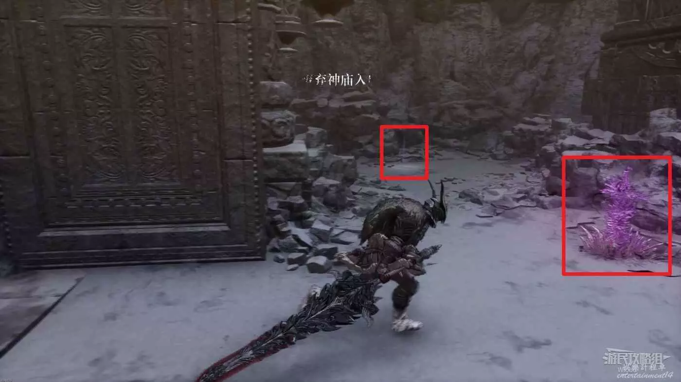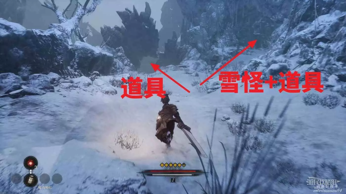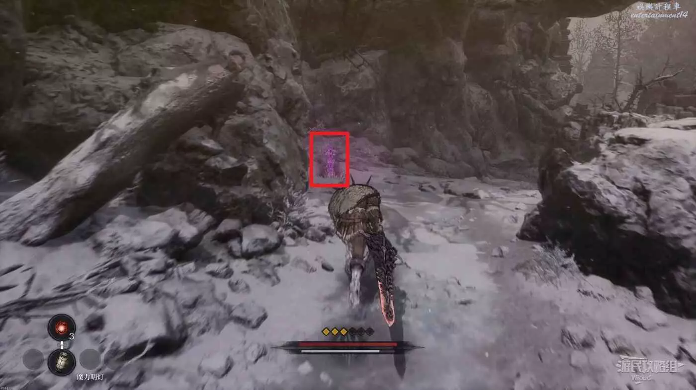 沿路走到開闊場景,擊敗中間的雪怪,往自己來時的方向看,右側上坡藏著一個詭異礦石直接走上去將其破壞掉。