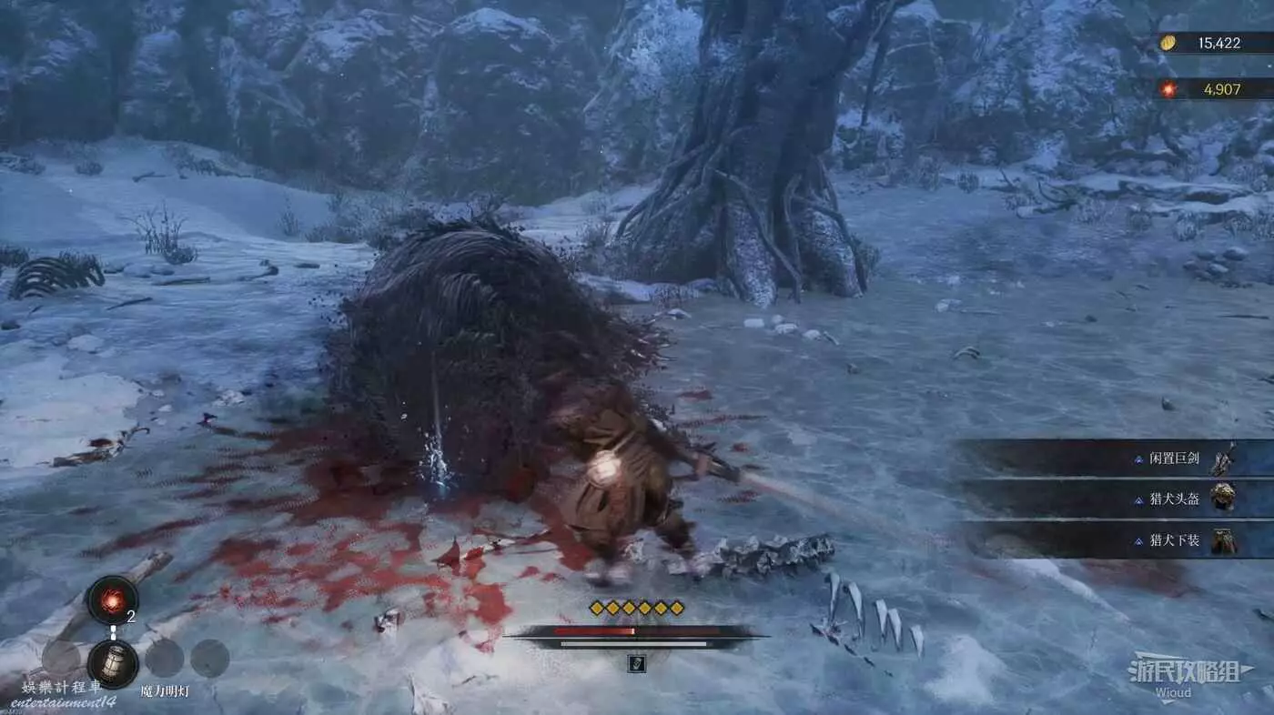 回到第二個篝火的位置往左走,擊敗前方的巨熊獲得【閒置巨劍】和獵犬頭盔與下裝。