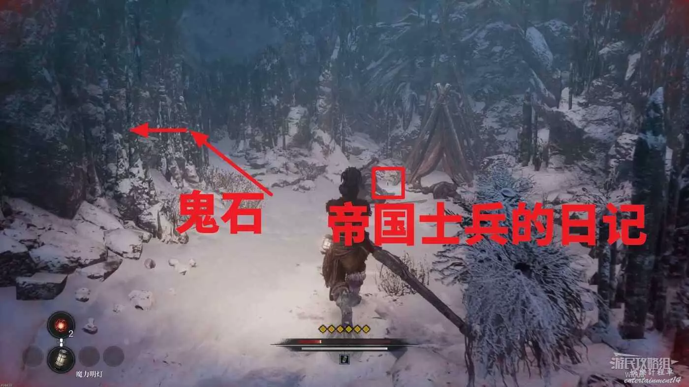 洞穴裡面有一個可背刺的敵人,拾取屍體旁的道具點獲得【帝國士兵的日記】,帳篷左側可以找到第二個鬼石。