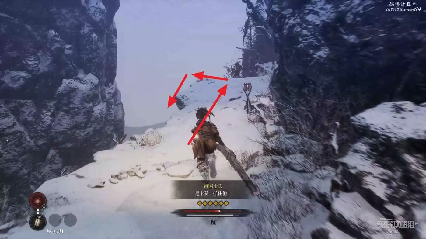 左側可以進入的房屋內可以拿到收集品【某個雪域學者的記錄】,然後走右側樓梯幹掉之前木橋上的敵人。