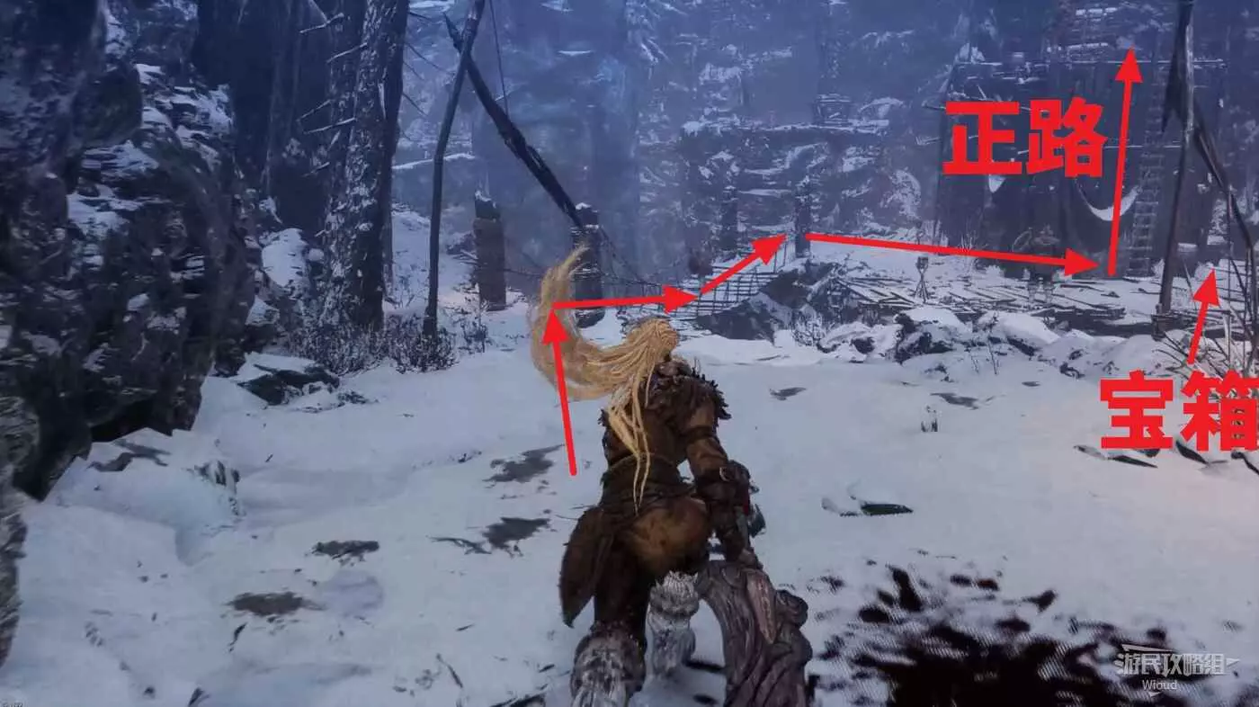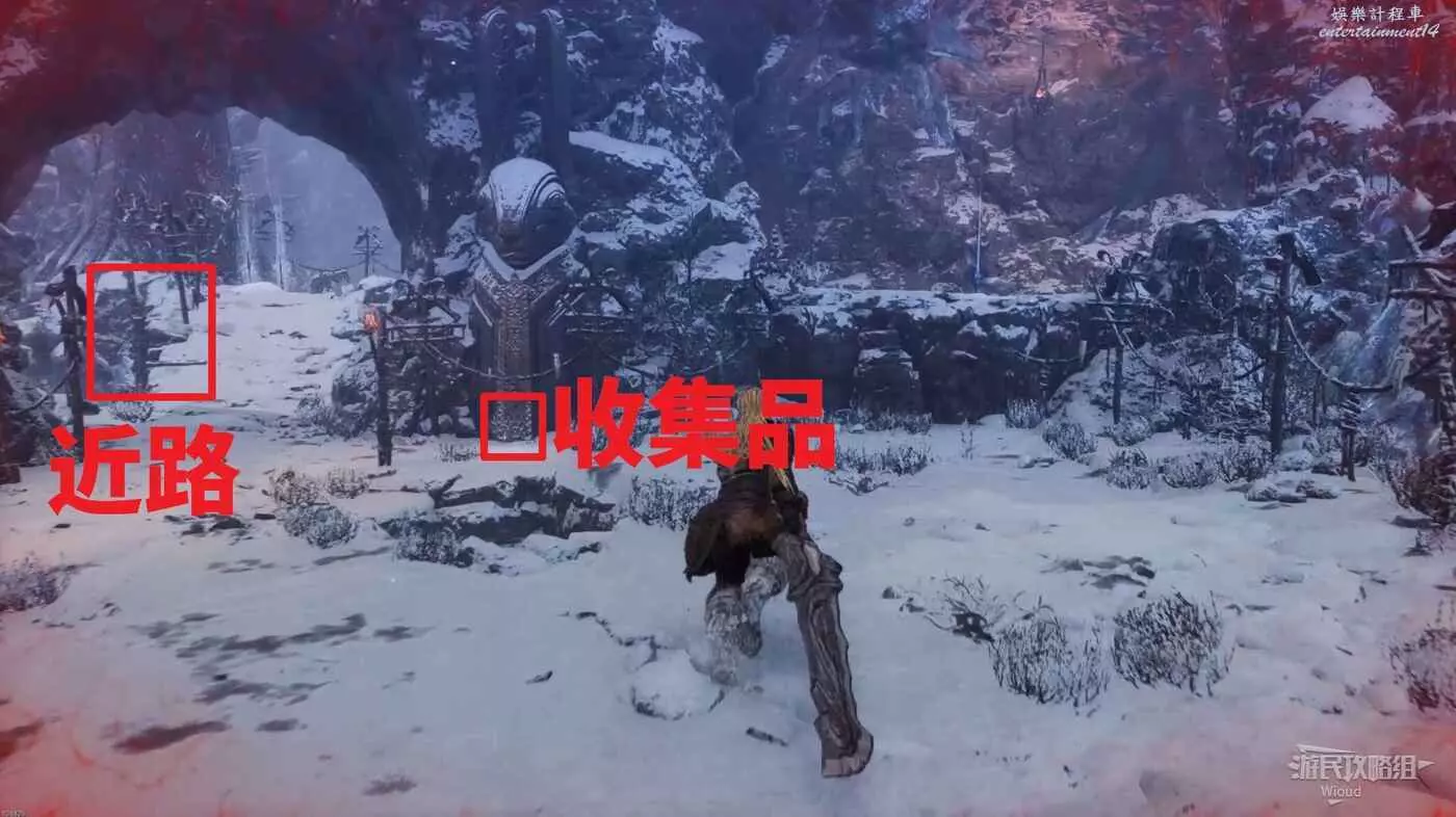 試煉之原篝火點先往右走,右側洞穴擊敗裡面的雪人拿沃克族戰士上裝和道具,前往走到盡頭直接拿道具。