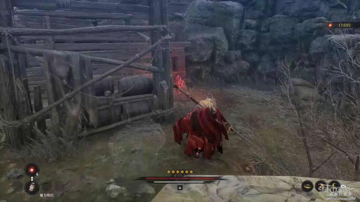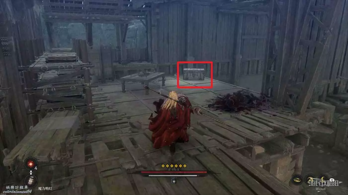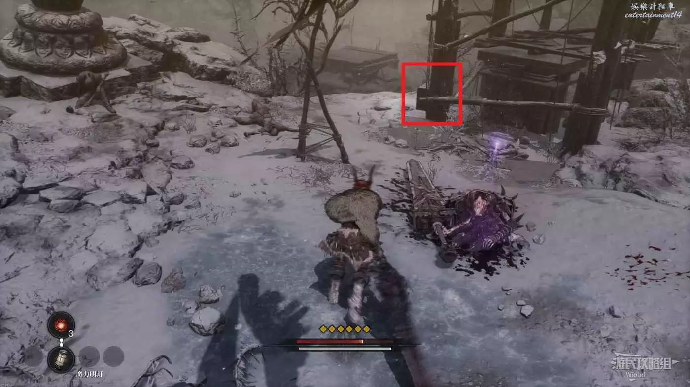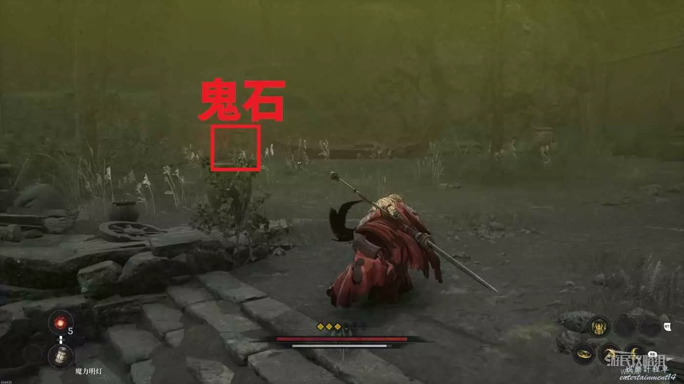 先解決前面出現的大量敵人,然後往左斜後方看,木架子的角落可以找到第二個【鬼石】。