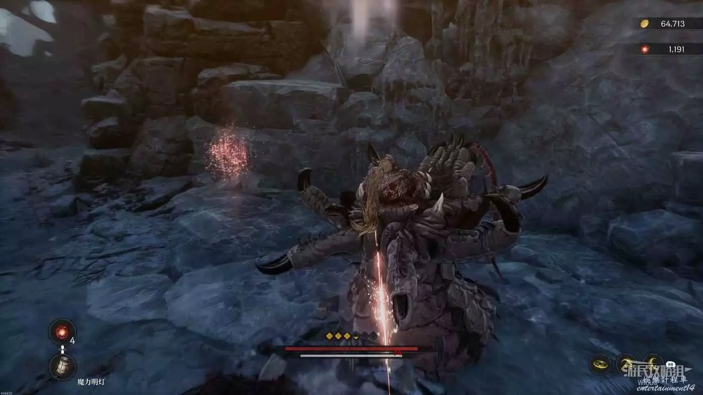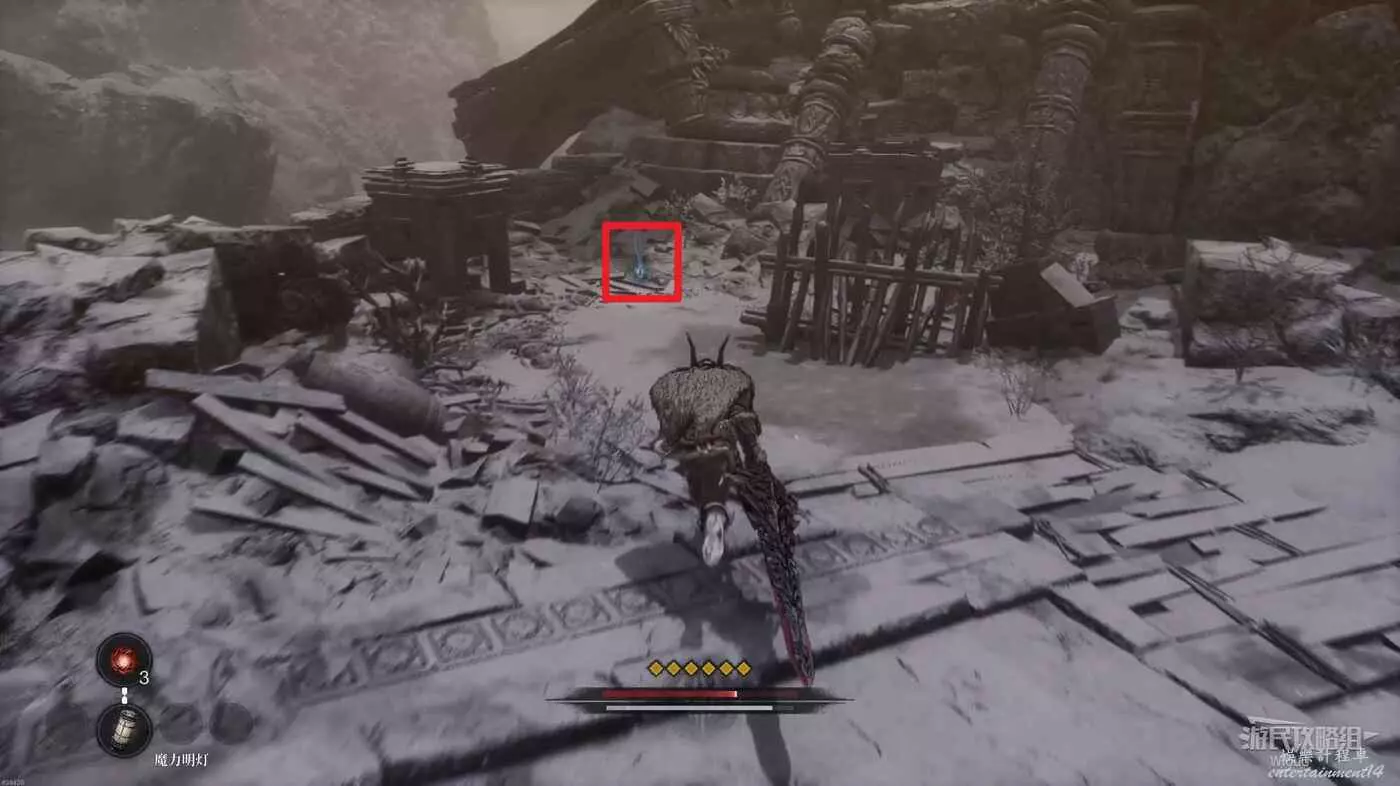 擊敗一個持盾士兵,右側紅光屍體可以拿一個靈魂之淚粉末,從前面冰柱右側跳到下面平台。