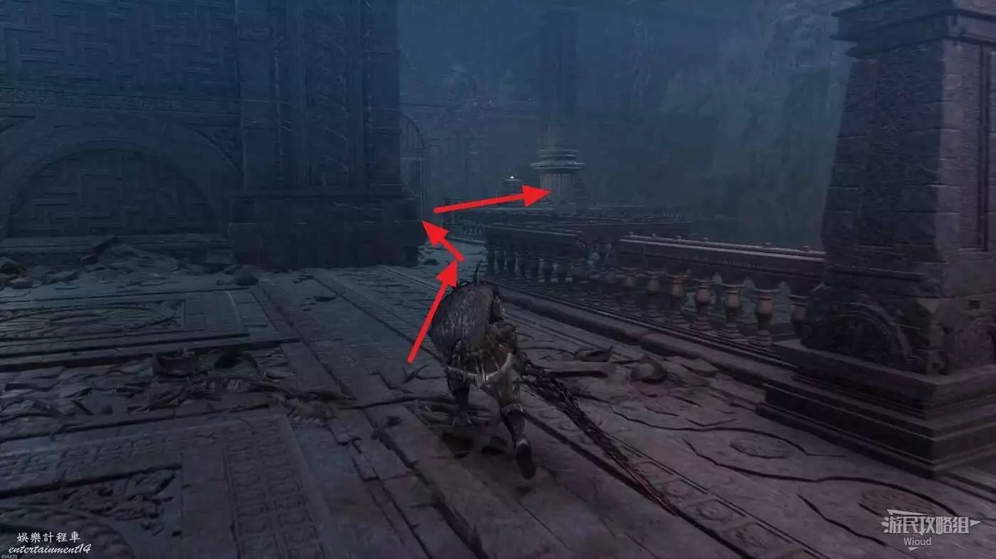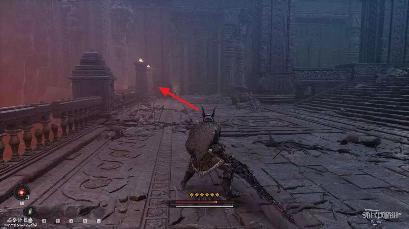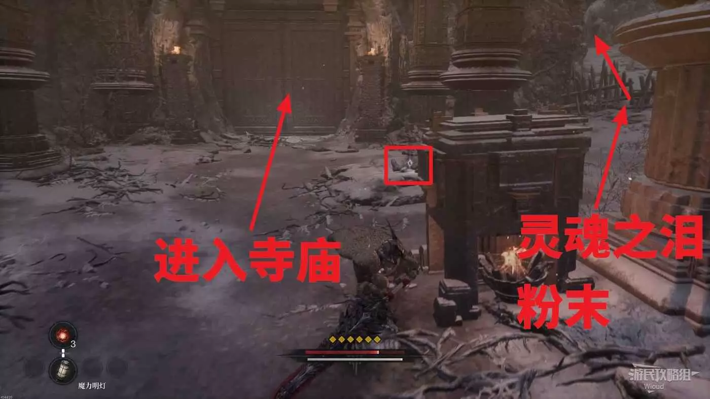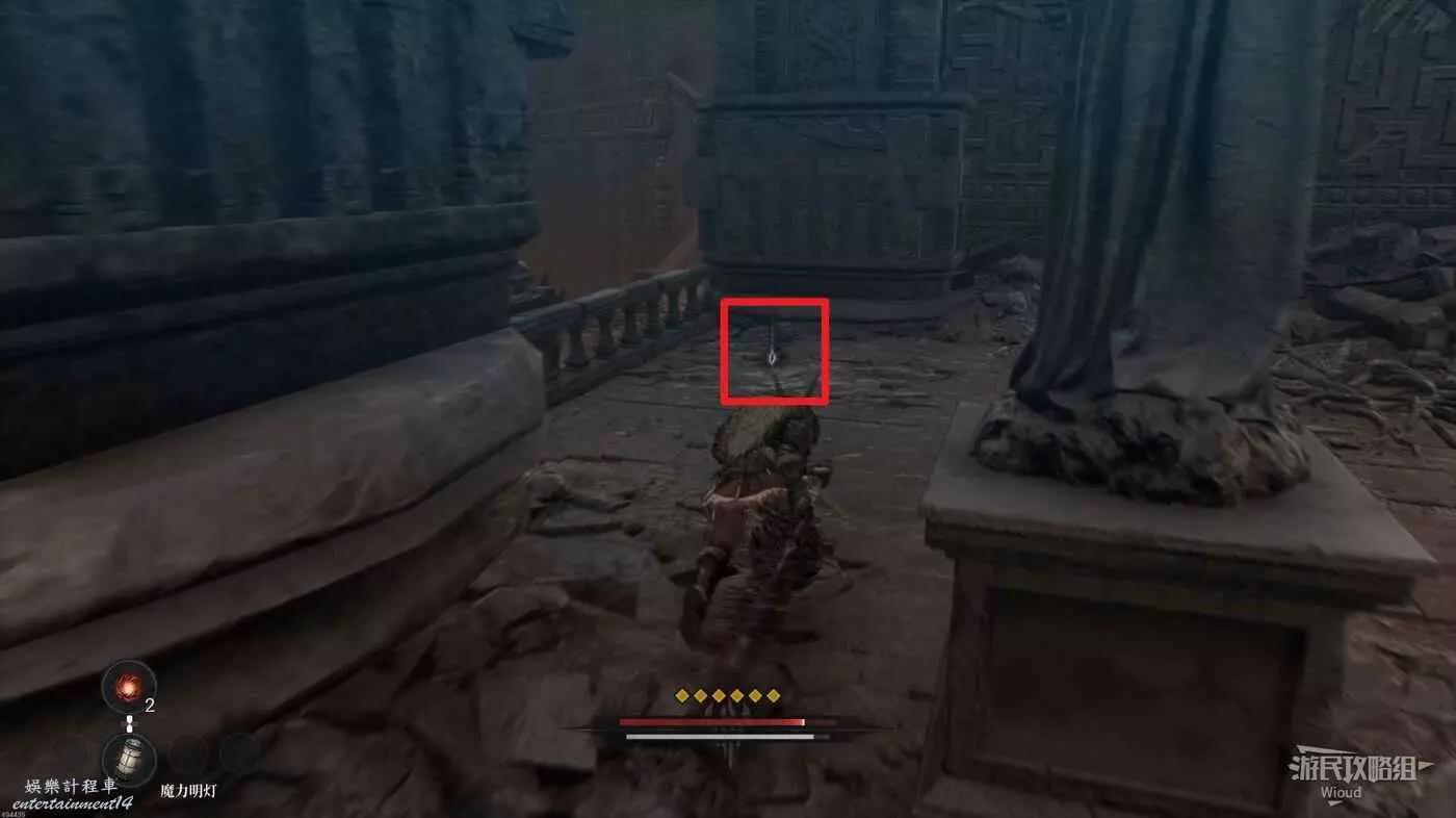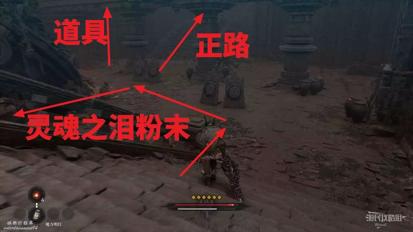 等石球過去往上走,拱門右側屍體處可以撿到一個【靈魂之淚粉末】,右側道路上面有個敵人可以先不管,敵人下面有一個紫色道具可拿,走到盡頭右拐可以看到下方很多敵人。