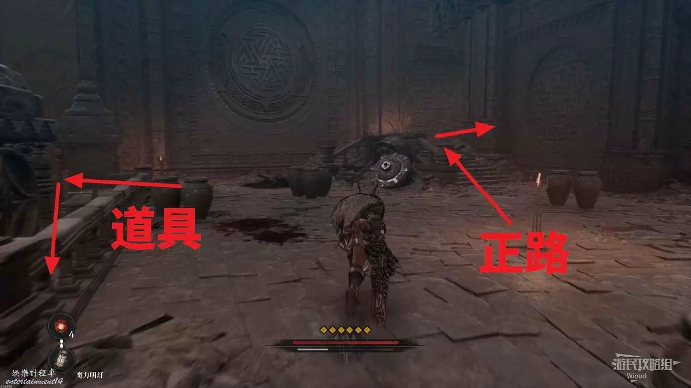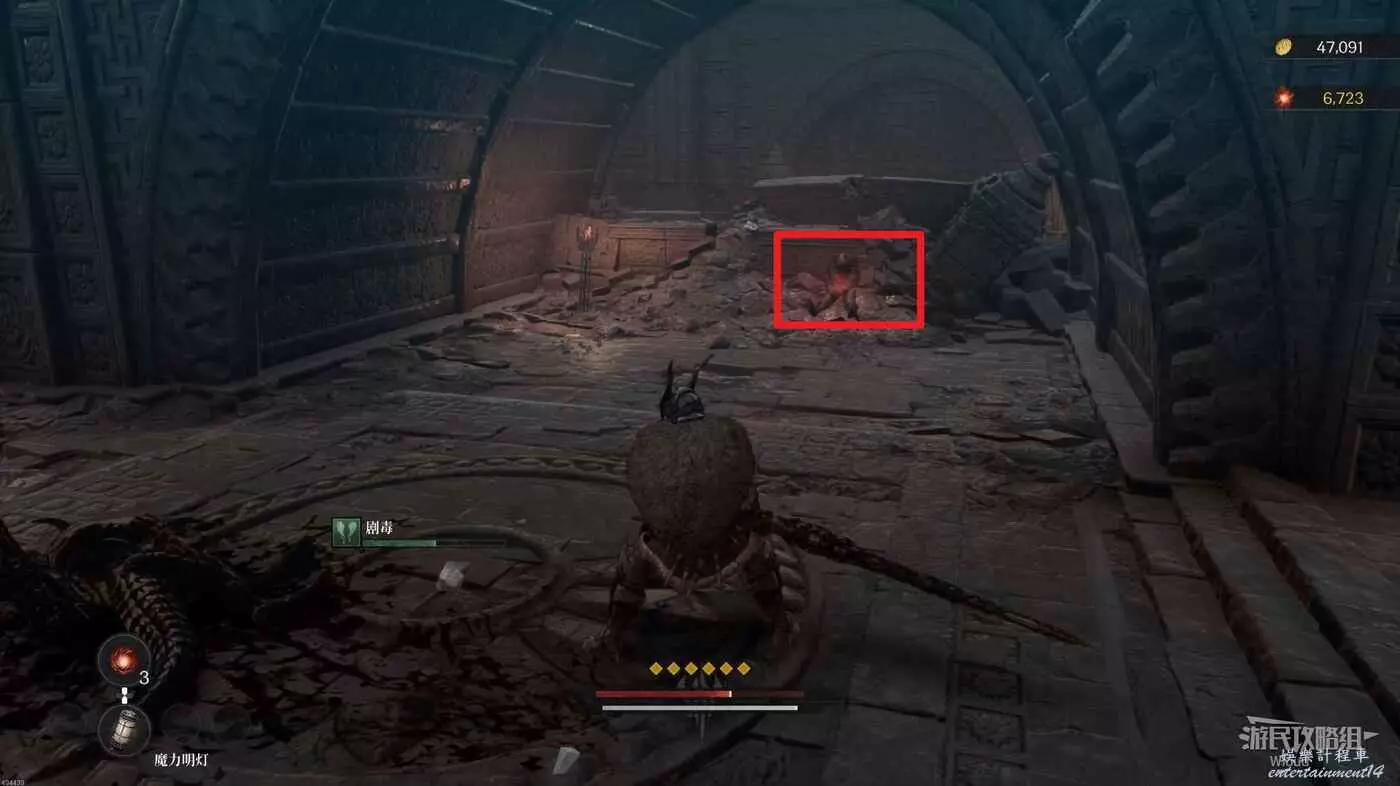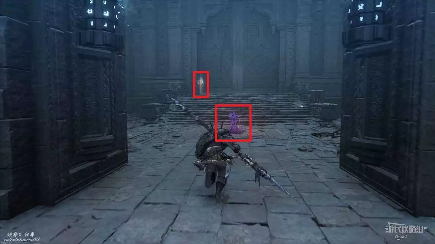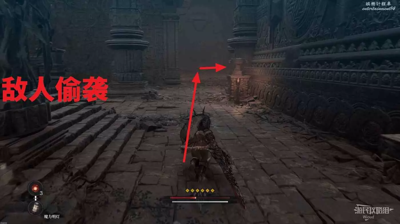 等石球過去往上走,拱門右側屍體處可以撿到一個【靈魂之淚粉末】,右側道路上面有個敵人可以先不管,敵人下面有一個紫色道具可拿,走到盡頭右拐可以看到下方很多敵人。