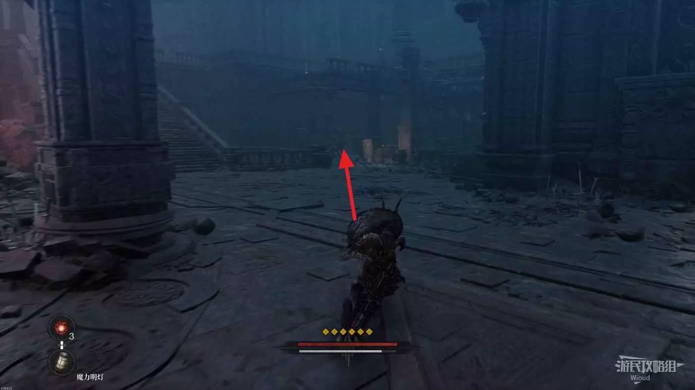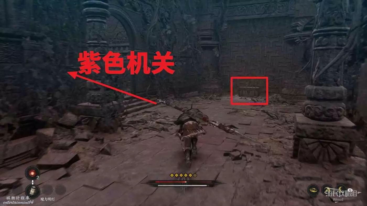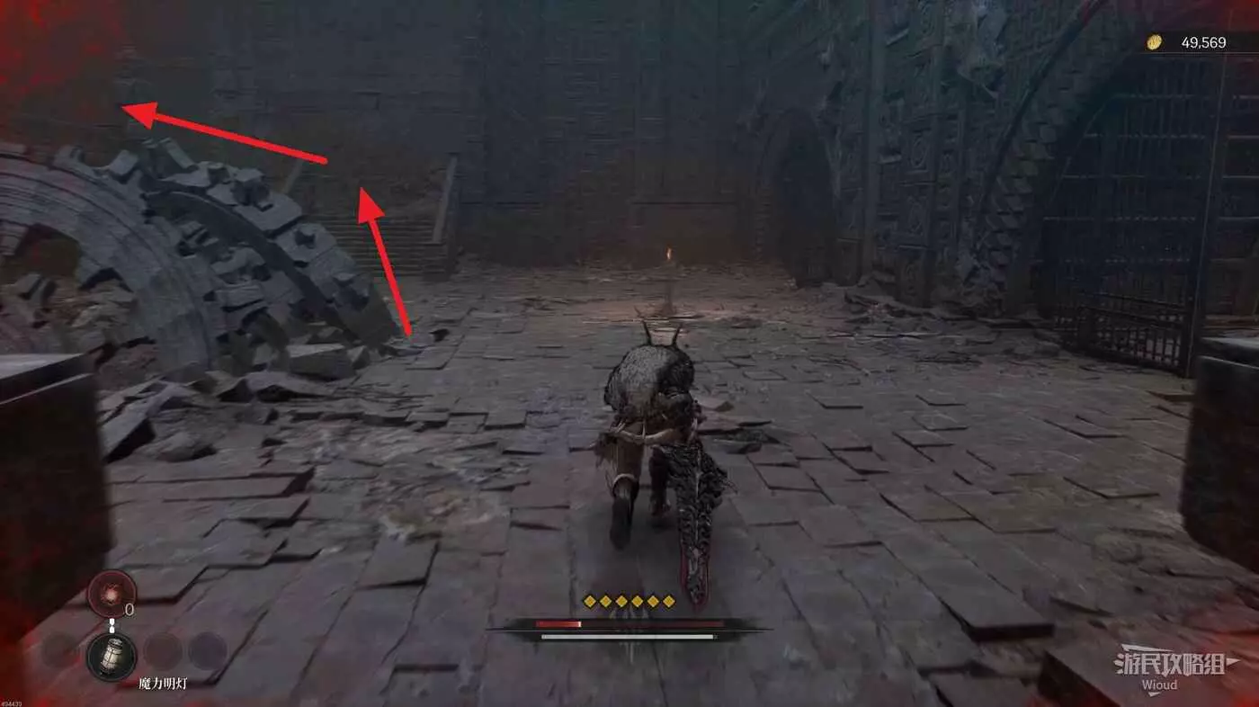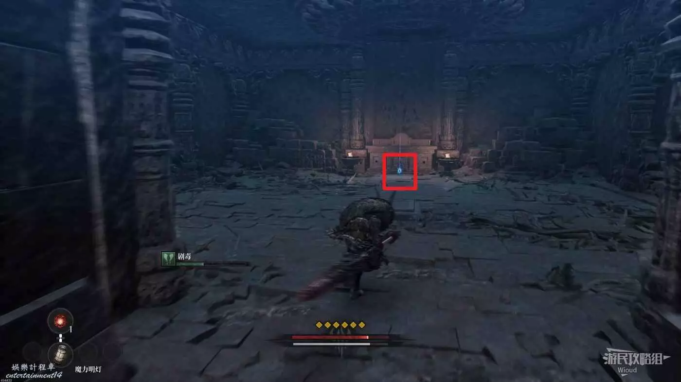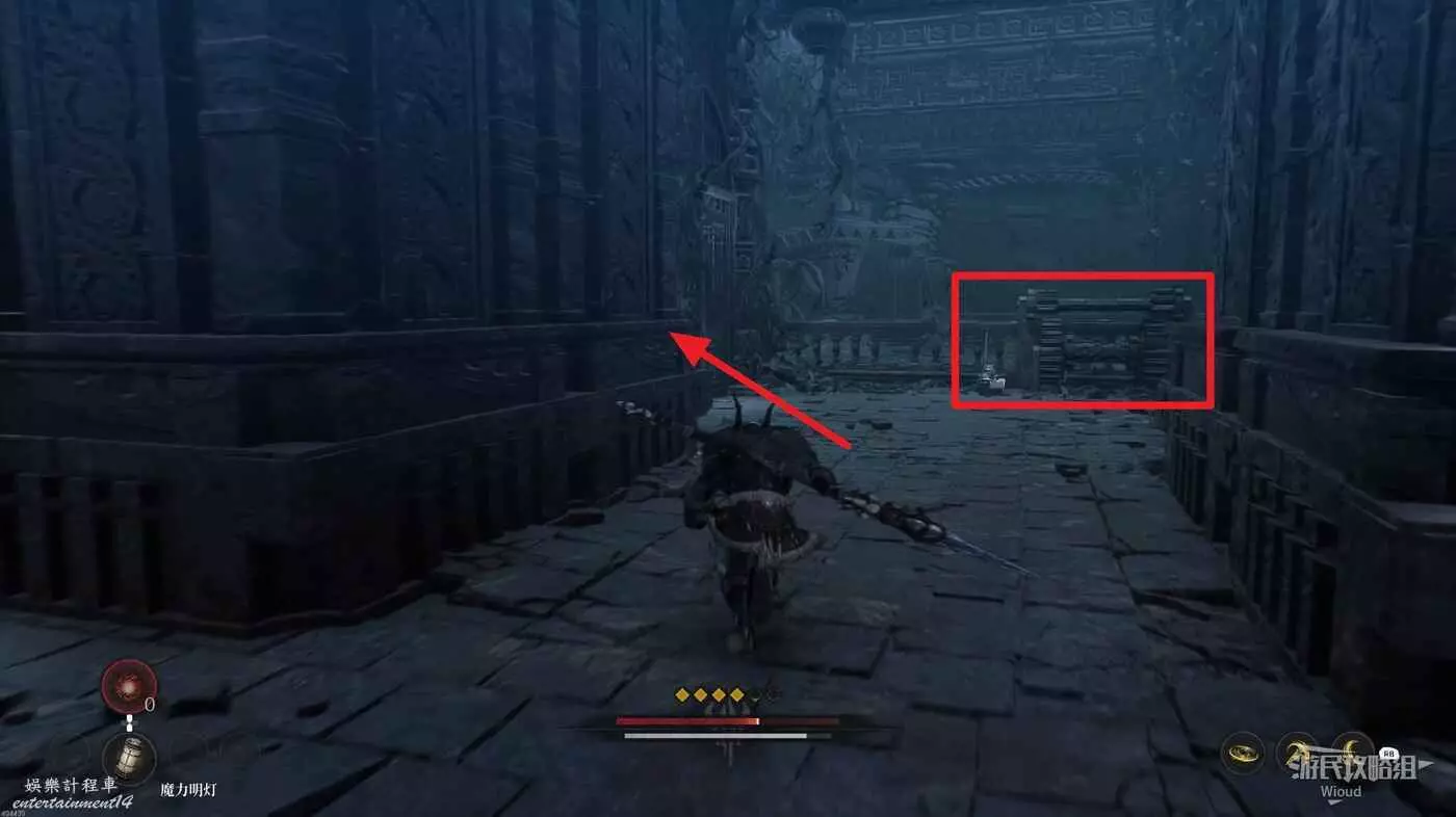等石球過去往上走,拱門右側屍體處可以撿到一個【靈魂之淚粉末】,右側道路上面有個敵人可以先不管,敵人下面有一個紫色道具可拿,走到盡頭右拐可以看到下方很多敵人。