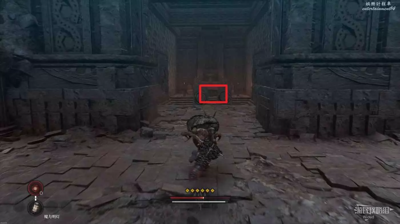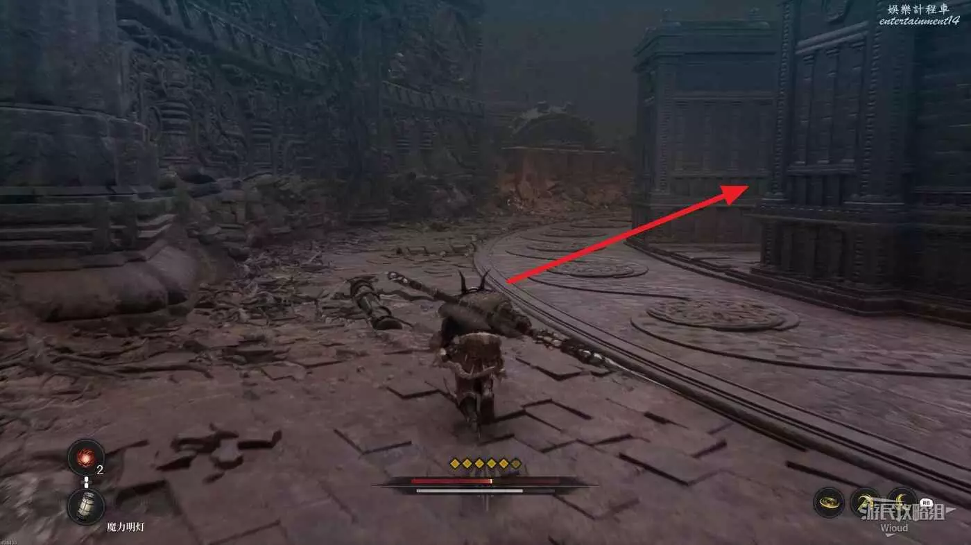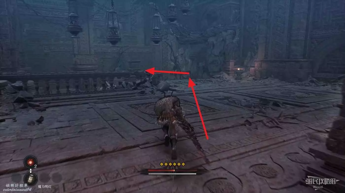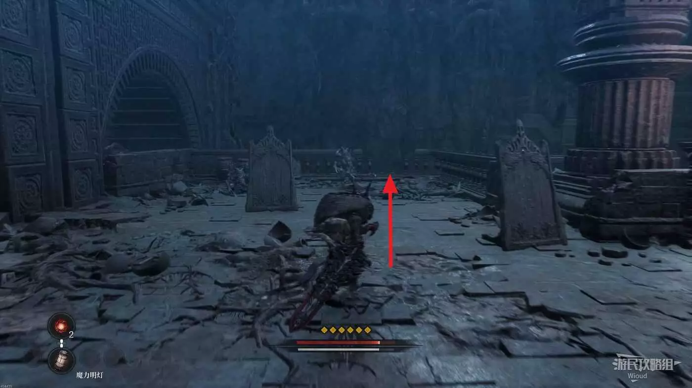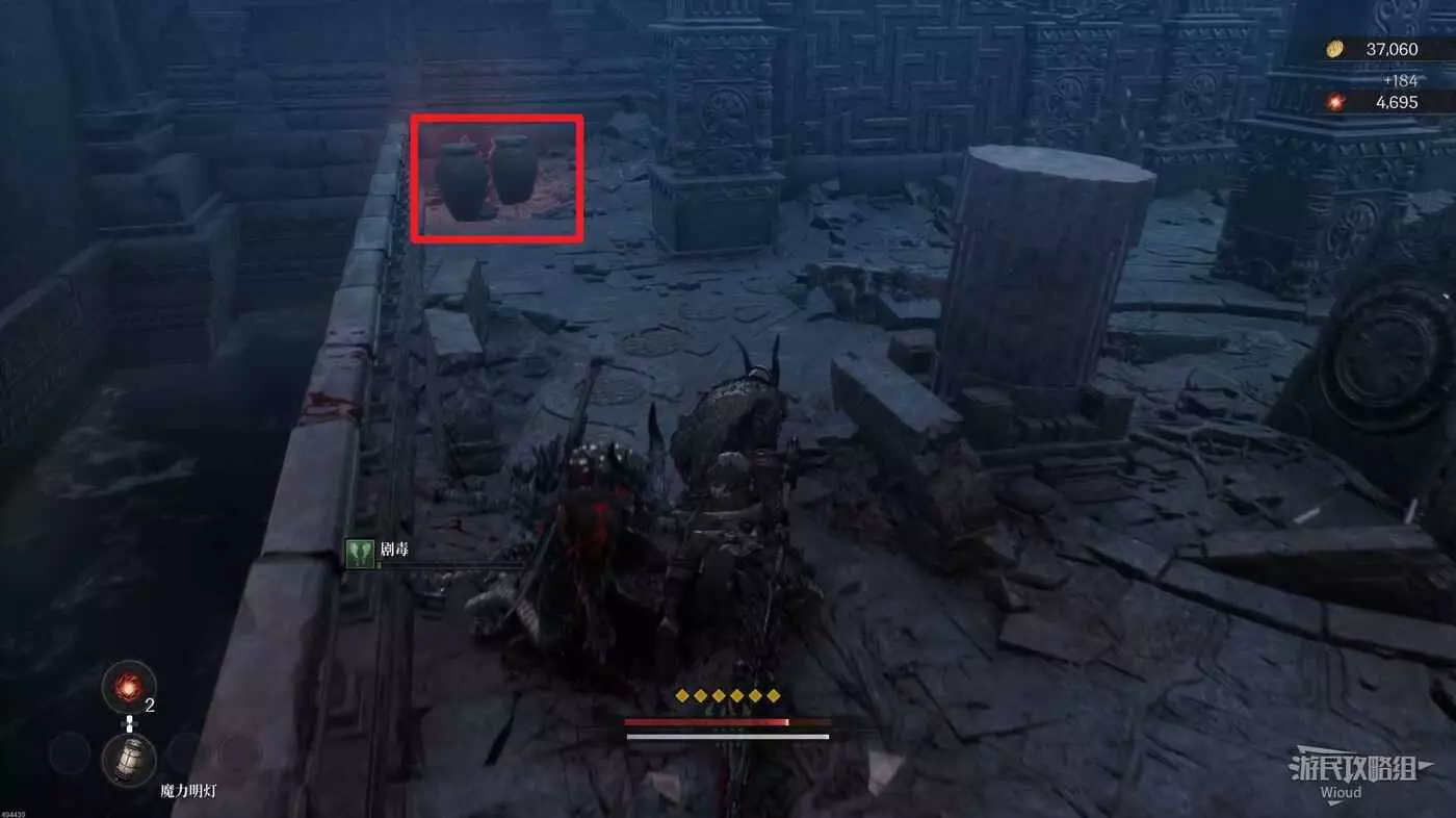 等石球過去往上走,拱門右側屍體處可以撿到一個【靈魂之淚粉末】,右側道路上面有個敵人可以先不管,敵人下面有一個紫色道具可拿,走到盡頭右拐可以看到下方很多敵人。