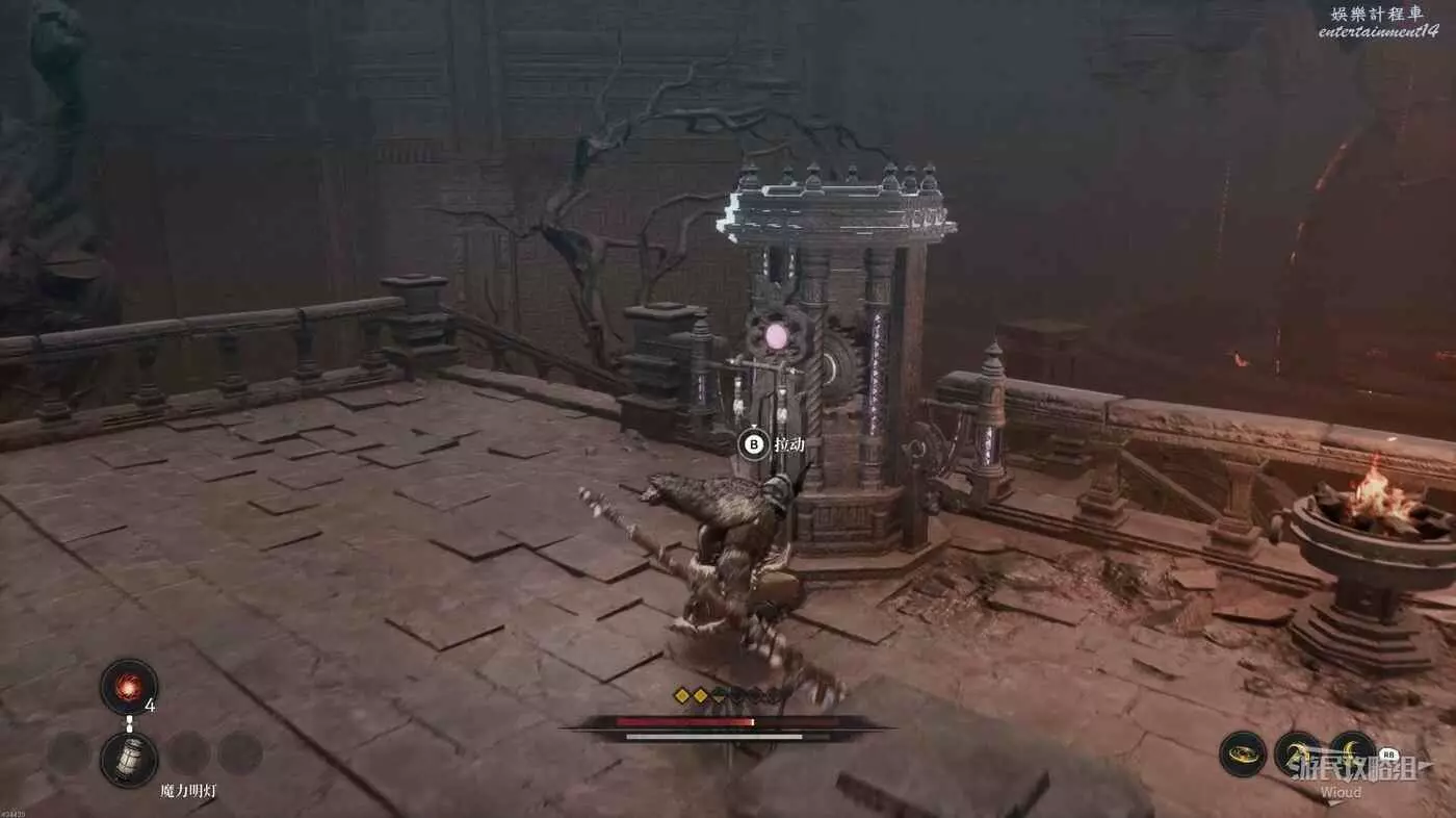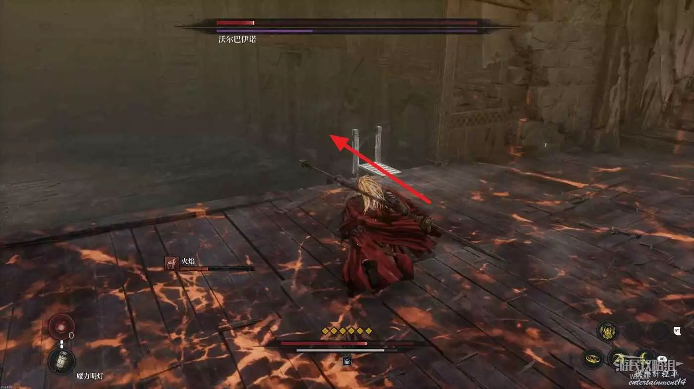 沿路走到盡頭,推車右側可以撿一個道具,將推車推到左下開啟第三個篝火的近路,沿著左側斜坡經過一段木橋走到BOSS房,開啟與沃爾巴伊諾的戰鬥。