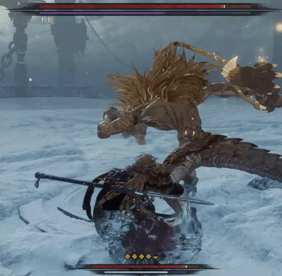 當敵人的血量過半時,敵人會突然遠離玩家後朝玩家吐出冰霧,注意與敵人的距離,主要躲避吐出的冰霧而不是地面的冰刺,敵人吐出的冰霧呈V字形,最好往中後躲避。