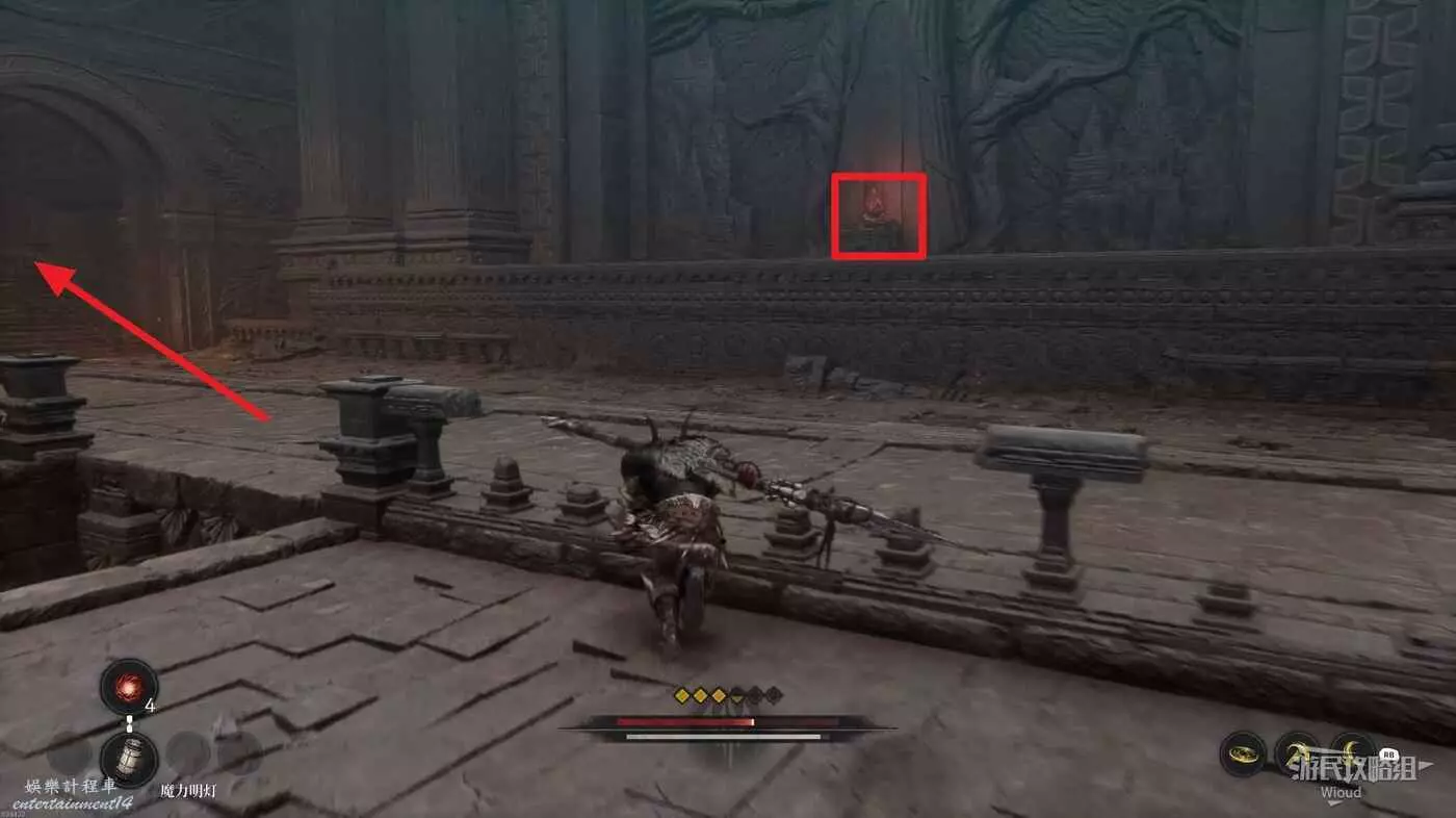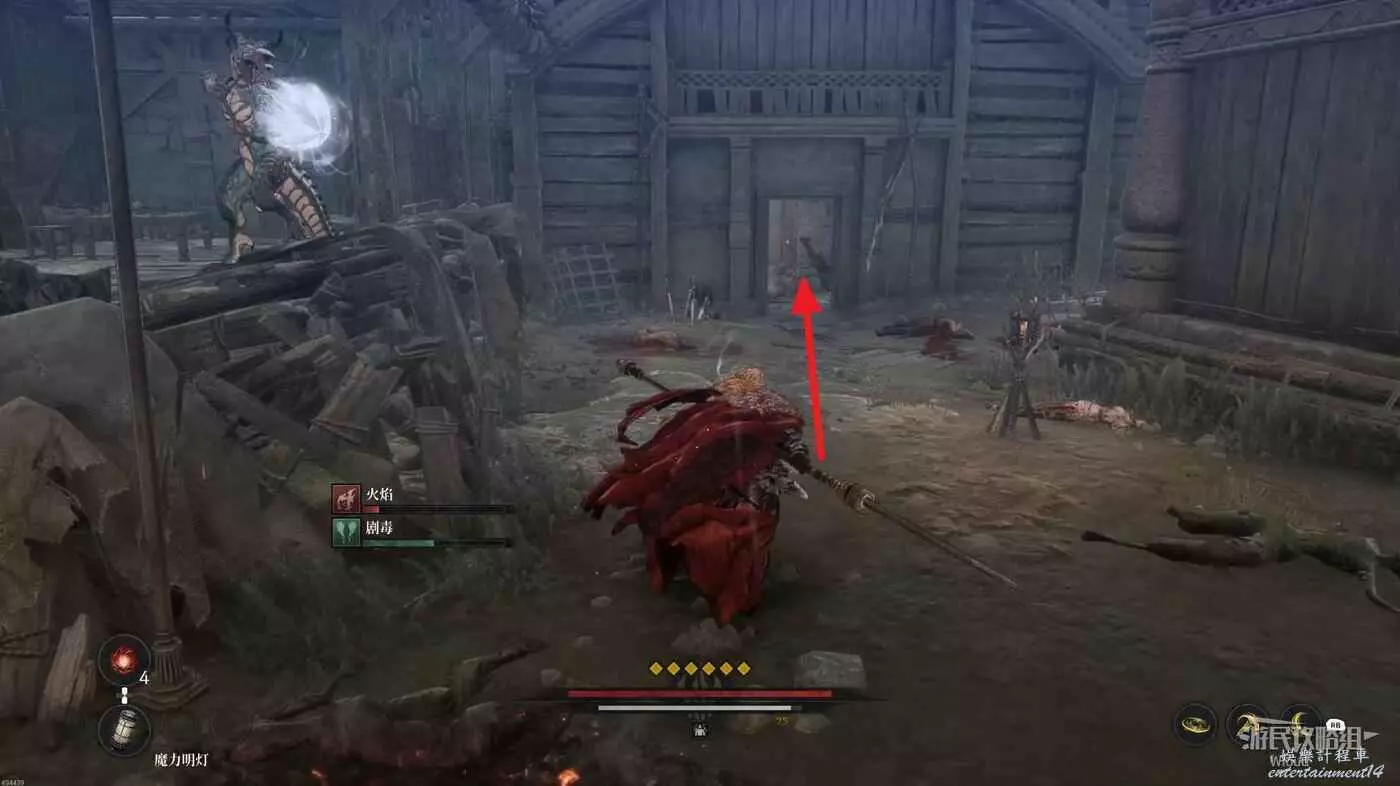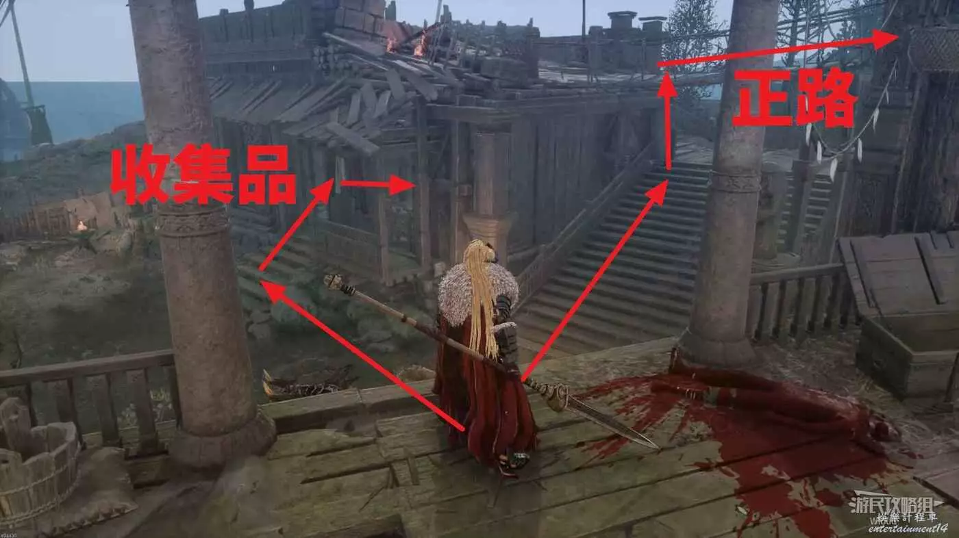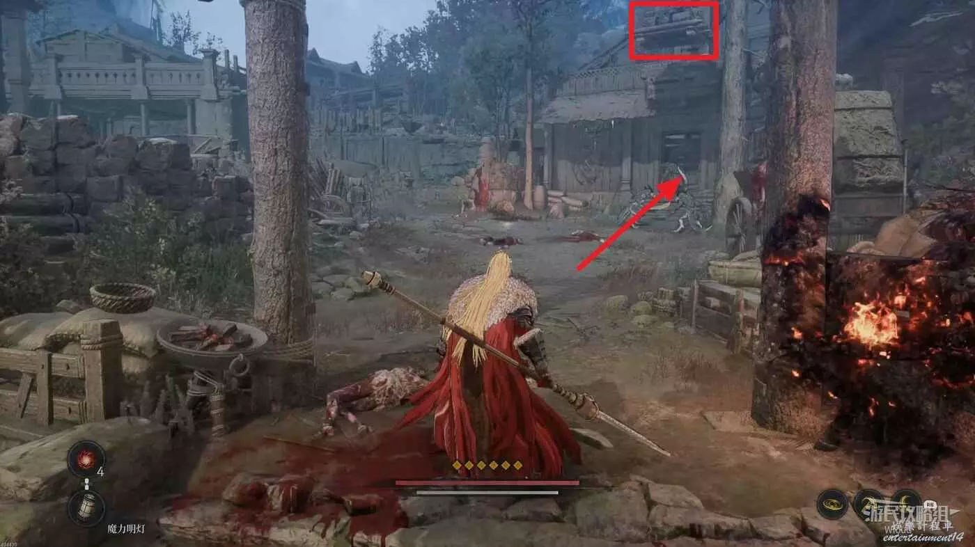 繼續沿路走,左側有一個可走的樓梯,頂部可以拿一個道具,穿過右前方拱門進入村莊。