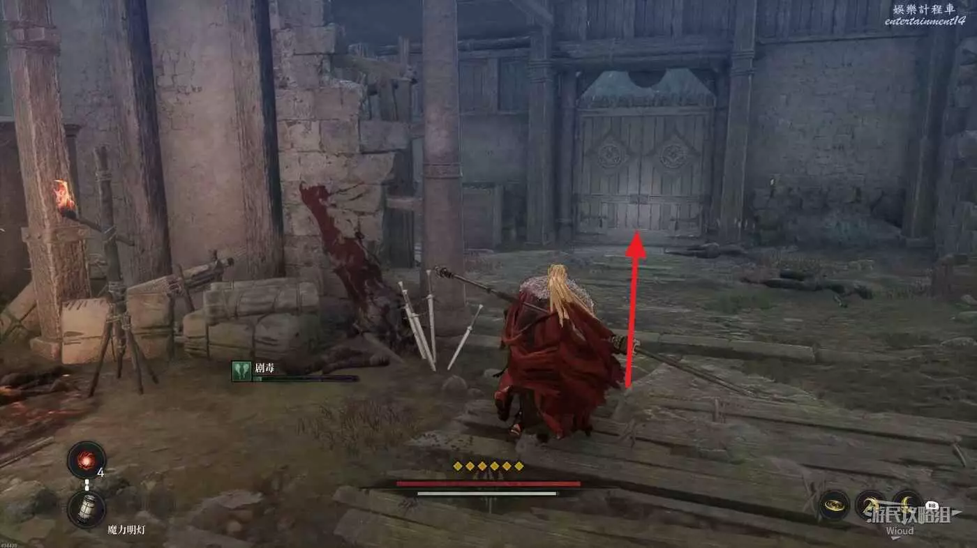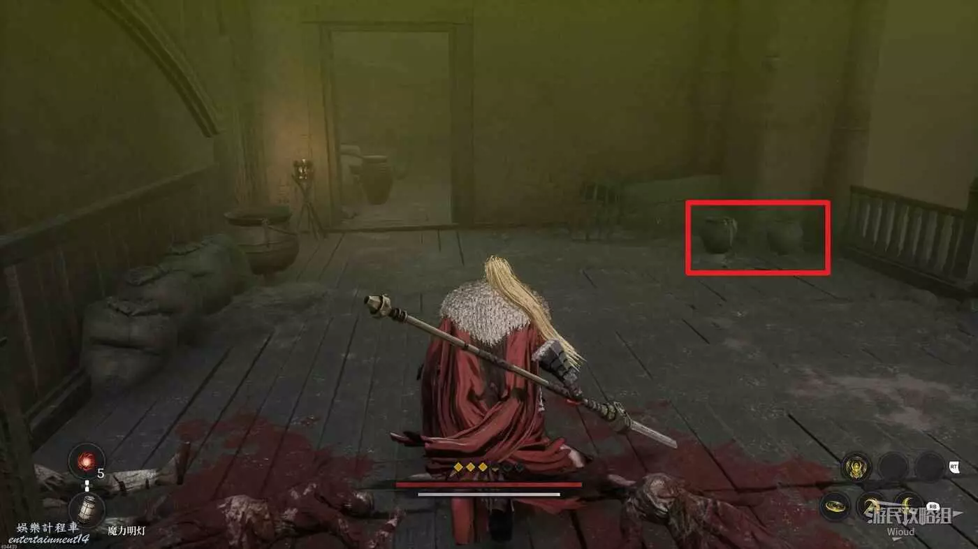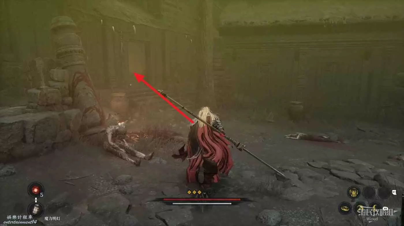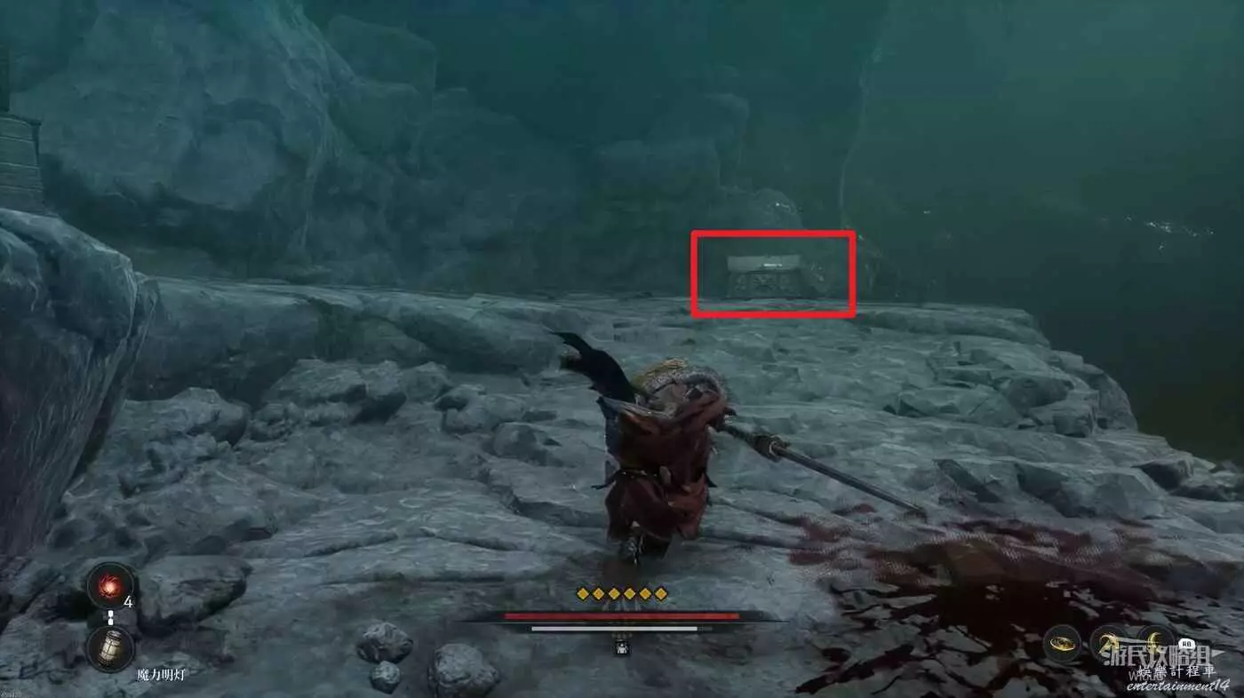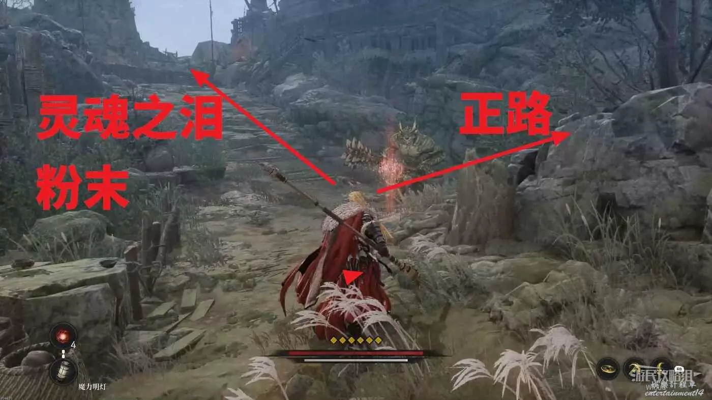 戰鬥區域右側發紅光的屍體處拿靈魂之淚粉末,屍體處繼續往右走。