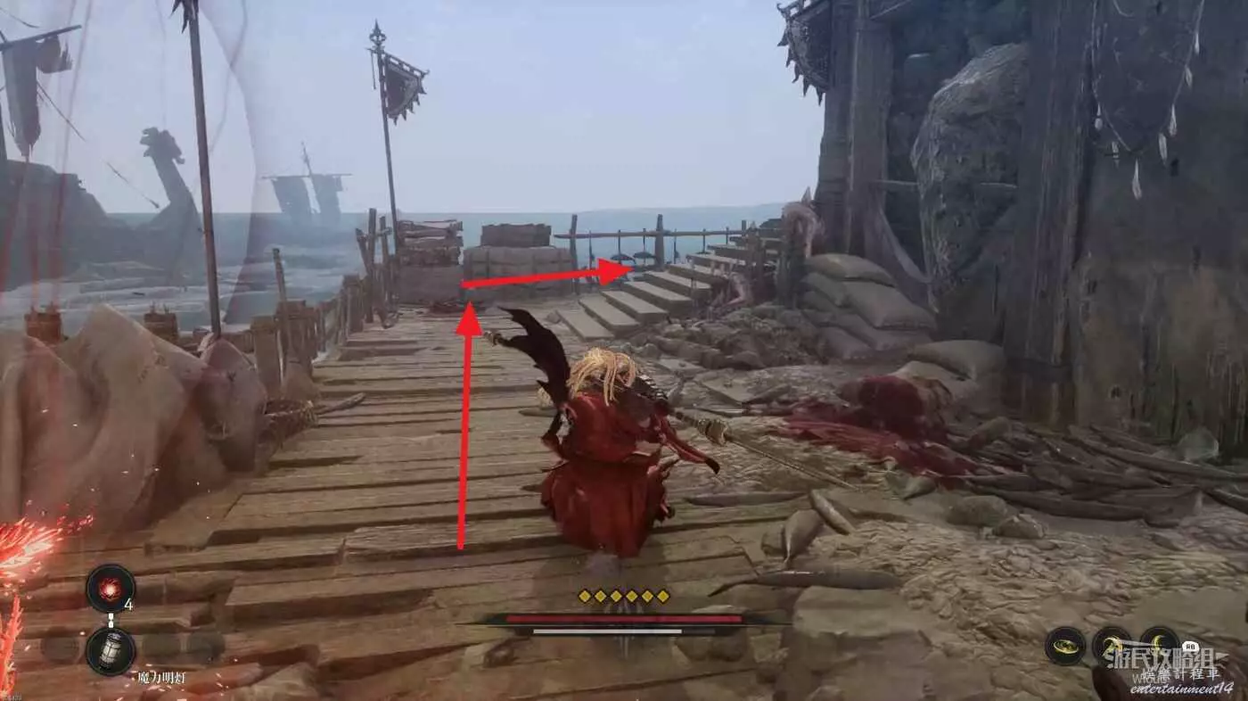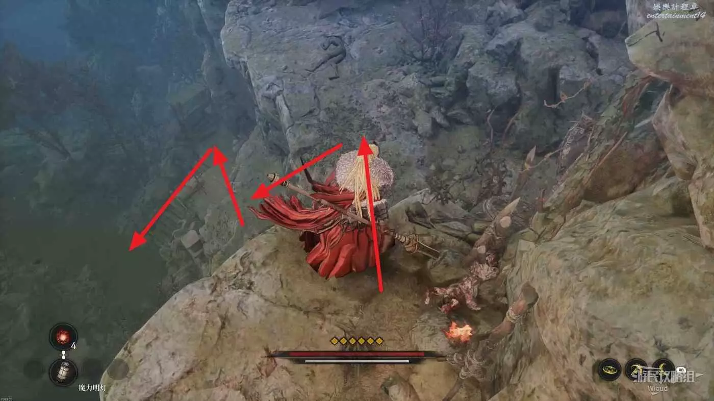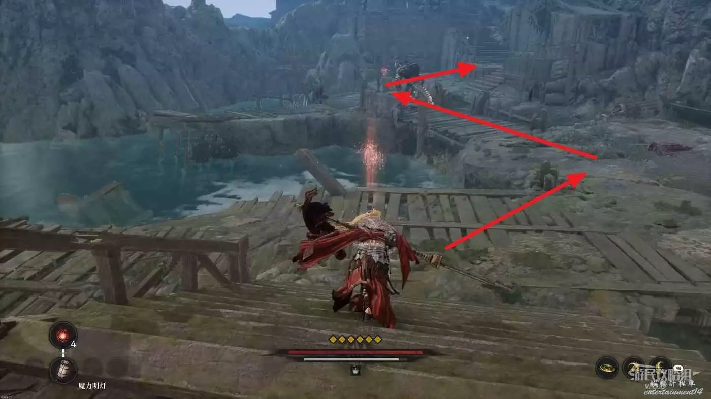 回到剛才的梯子凹口,爬梯子回到破壞鬼石的位置,沿著右邊的臺階逐級往下跳。