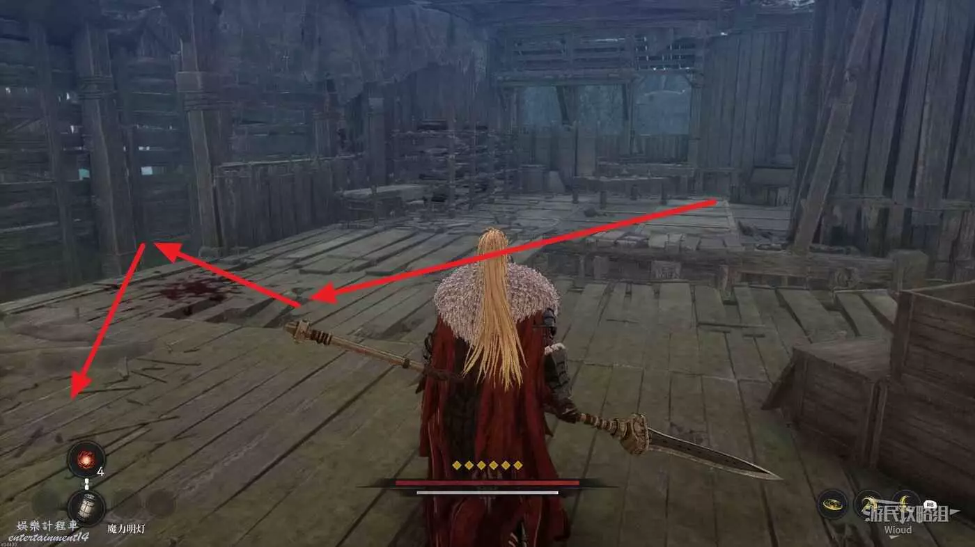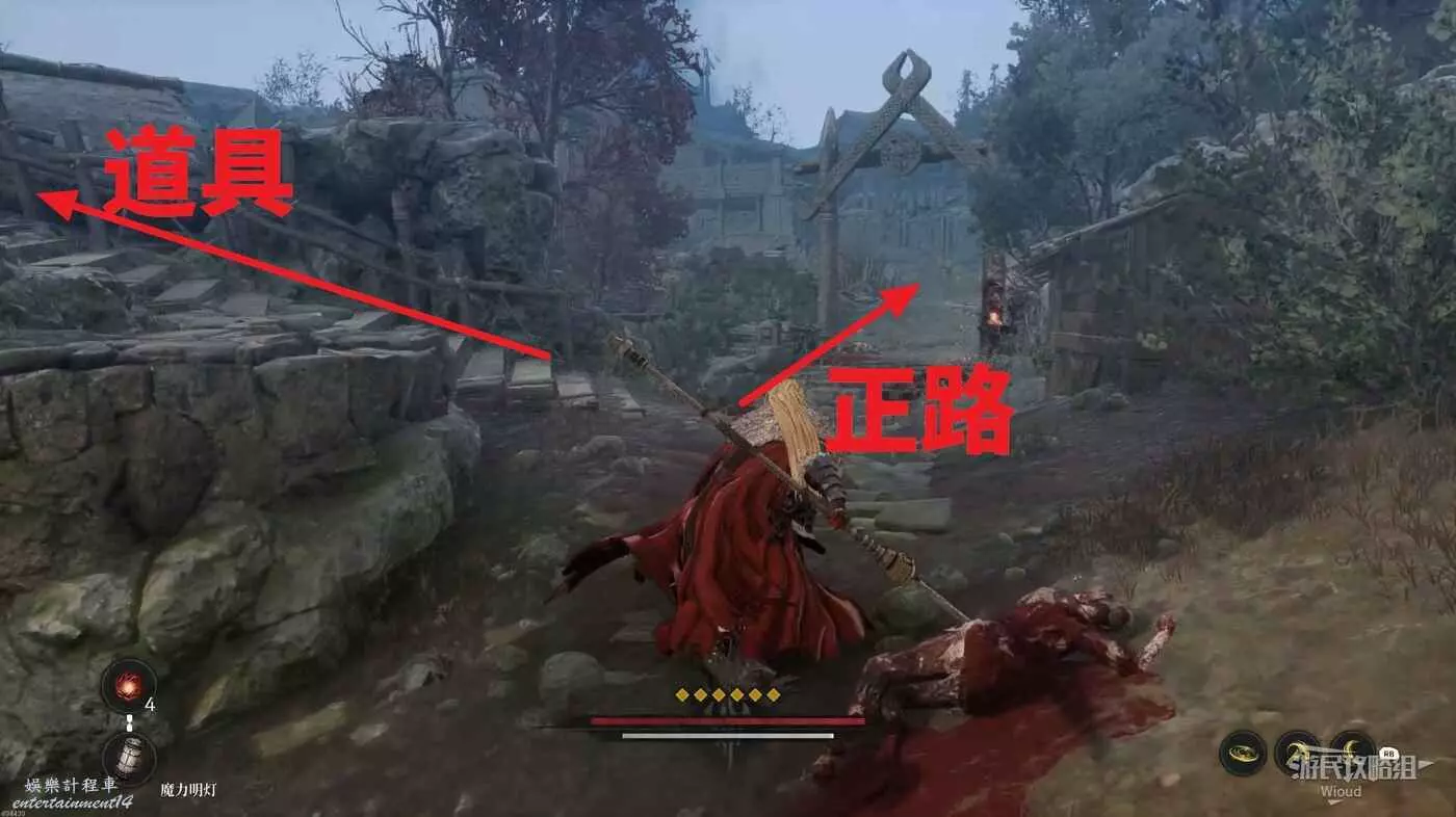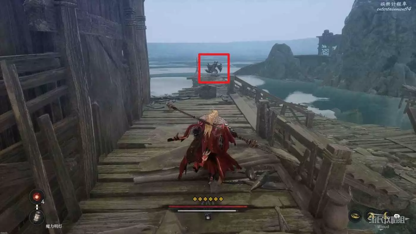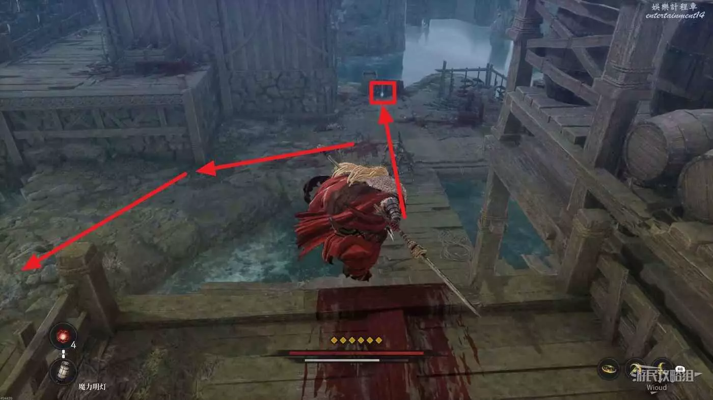 經過木橋從前面屋頂左側的梯子下去,往左走經過第二段木橋,這段木橋會刷出大量敵人。