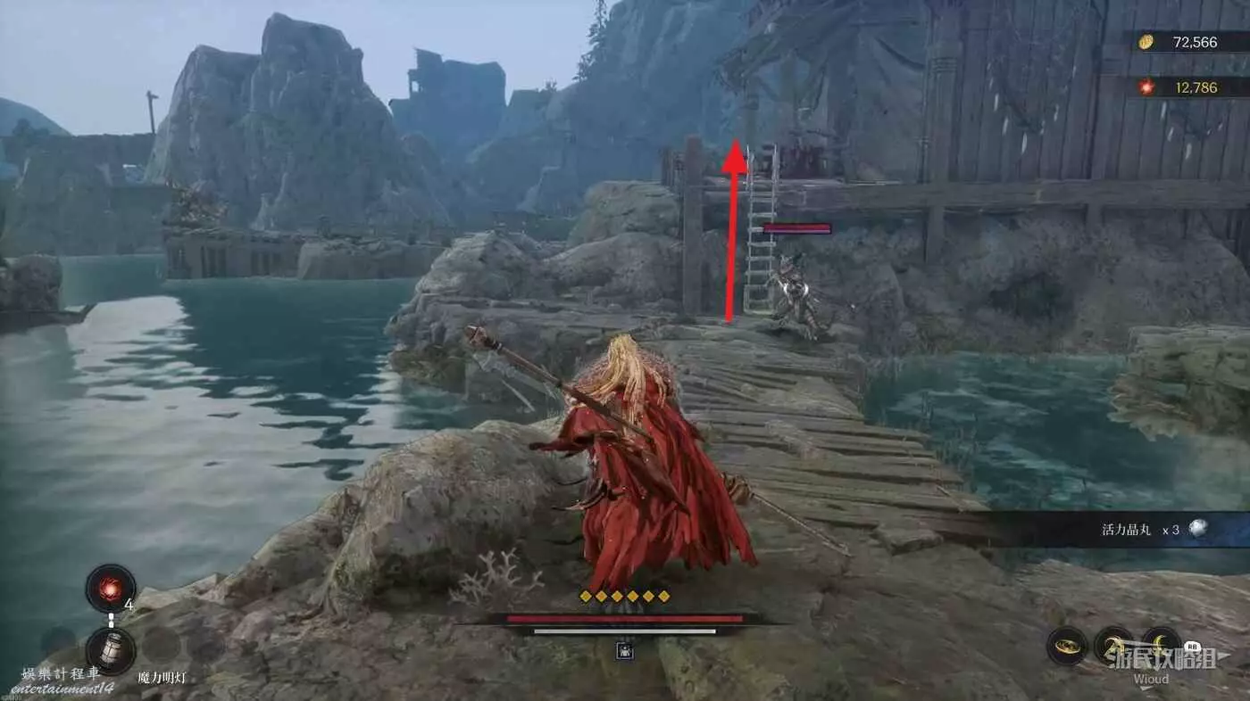幹掉中間蜥蜴人先往左走,盡頭屍體處可以撿一個【靈魂之淚粉末】,再往右走經過一段木橋爬上盡頭處梯子。