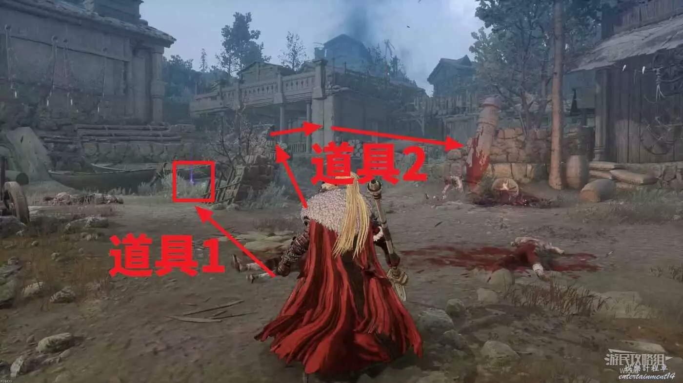 左側放船的區域可以拿一個道具,右前方開放建築沿著箭頭所示路線走右側小門可以拿第二個道具。
