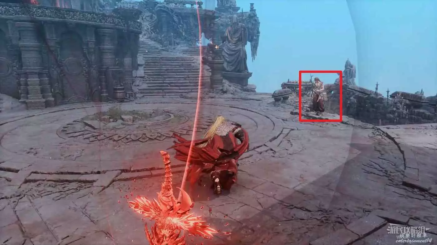 先擊敗出現的巨劍士兵,旁邊拾取道具眼淚召喚石,爬右側樓梯上去。