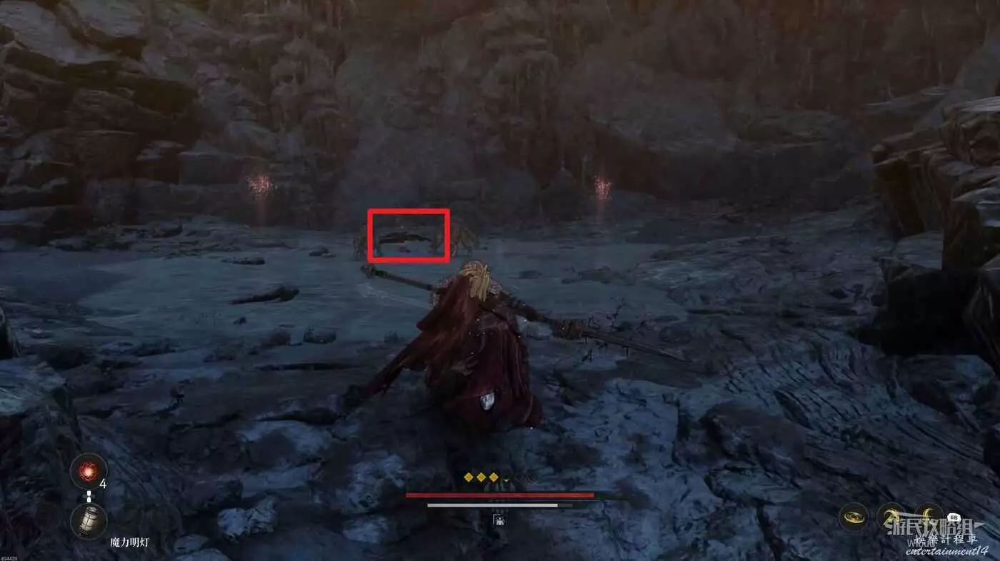 洞穴門口不遠處撿到重要道具【魔力明燈】,沿路走到盡頭發紅光的屍體旁,與屍體互動獲得【靈魂之淚粉末】。