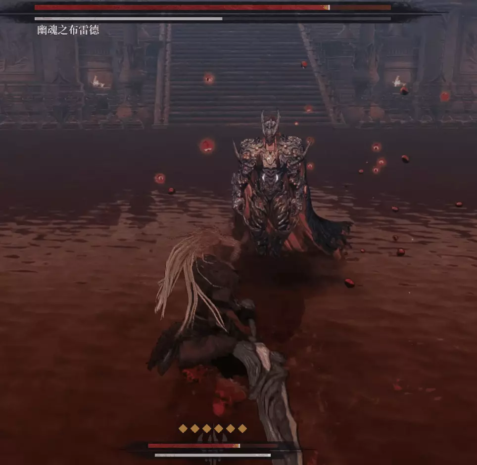 幽魂佈雷德還會突然召喚一把大錘,短暫蓄力後砸向地面,周圍地塊也會隨著大錘砸下突出一片紅草,面對這招直接走到敵人面前防禦,等敵人出招後立刻接一個蓄力重擊。