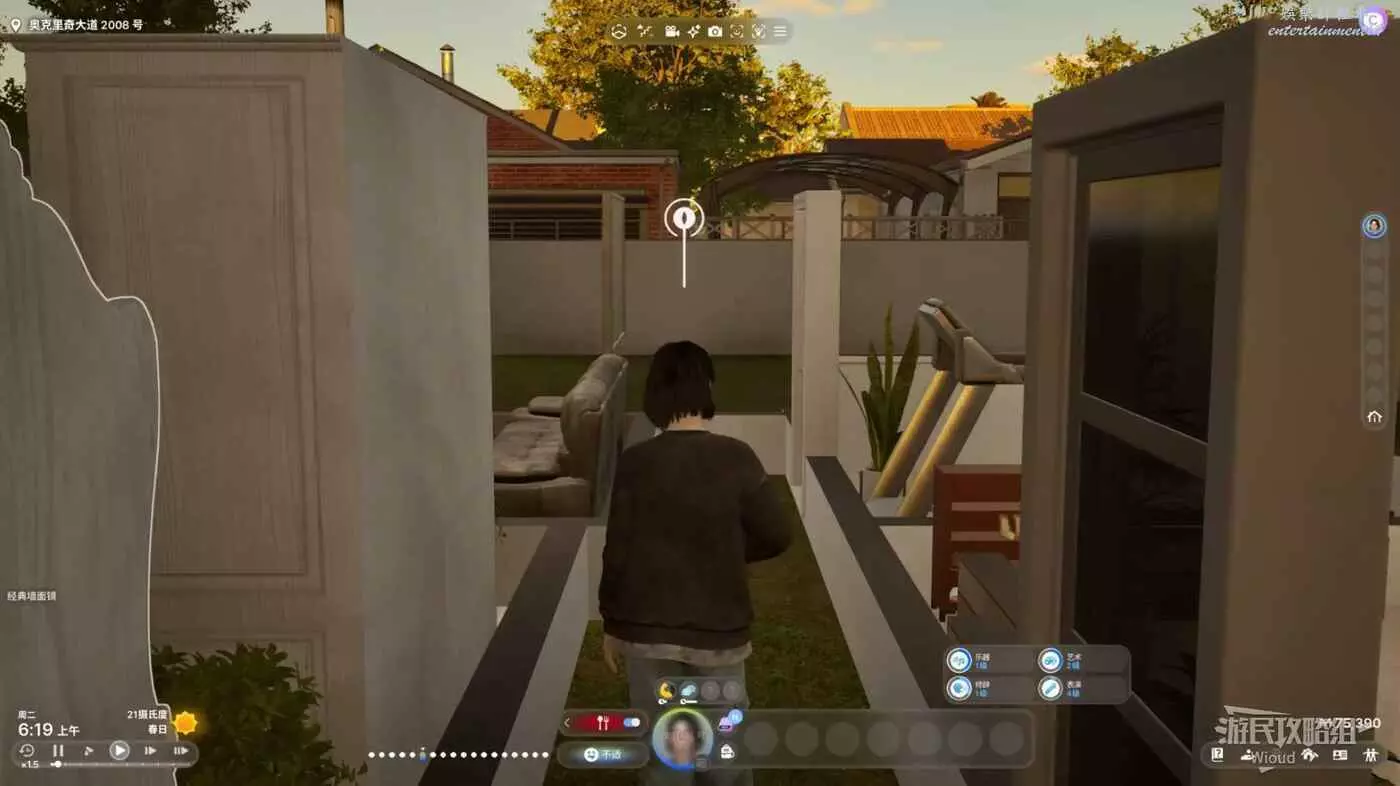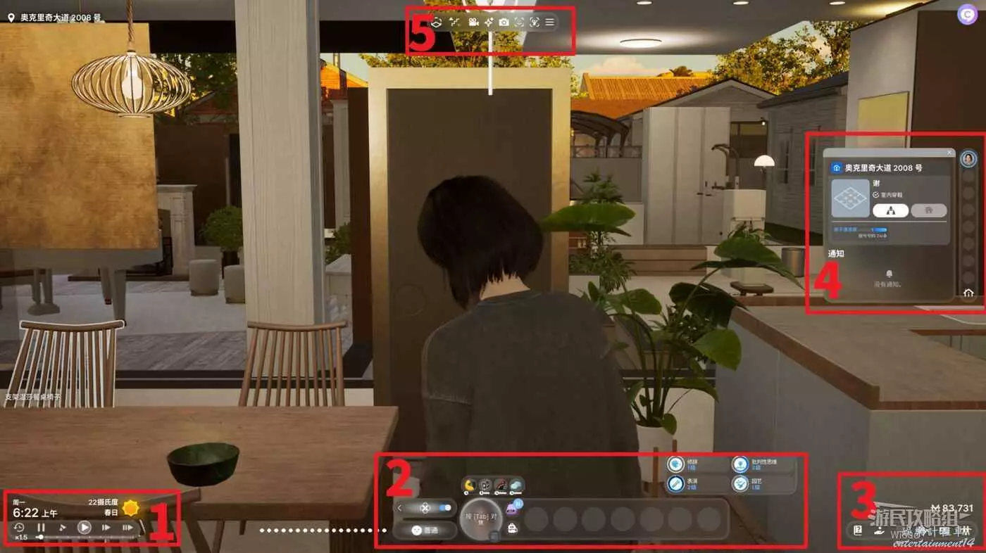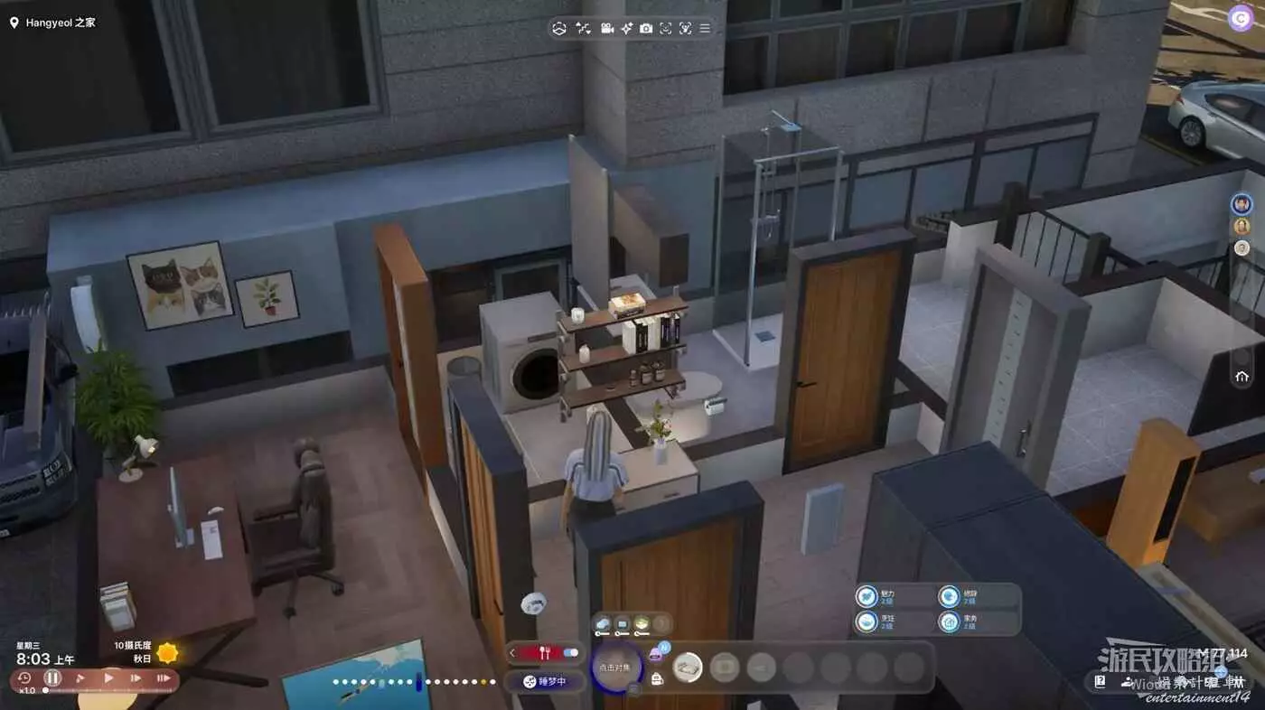 5、遊戲的次要功能表,從左到右依次是【切換牆壁顯示】、【切換房屋層數】、【相比模式】、【濾鏡選擇】、【拍照模式】、【面部捕捉】、【動作捕捉】與主菜單;相機模式主要切換玩家視角,拍照模式就是拍照。