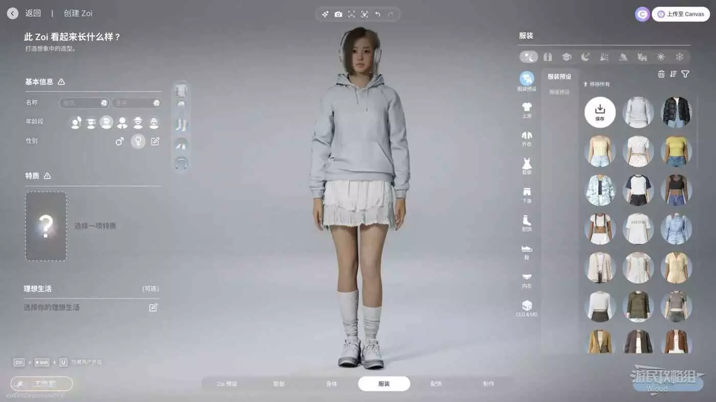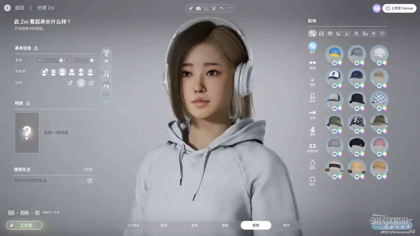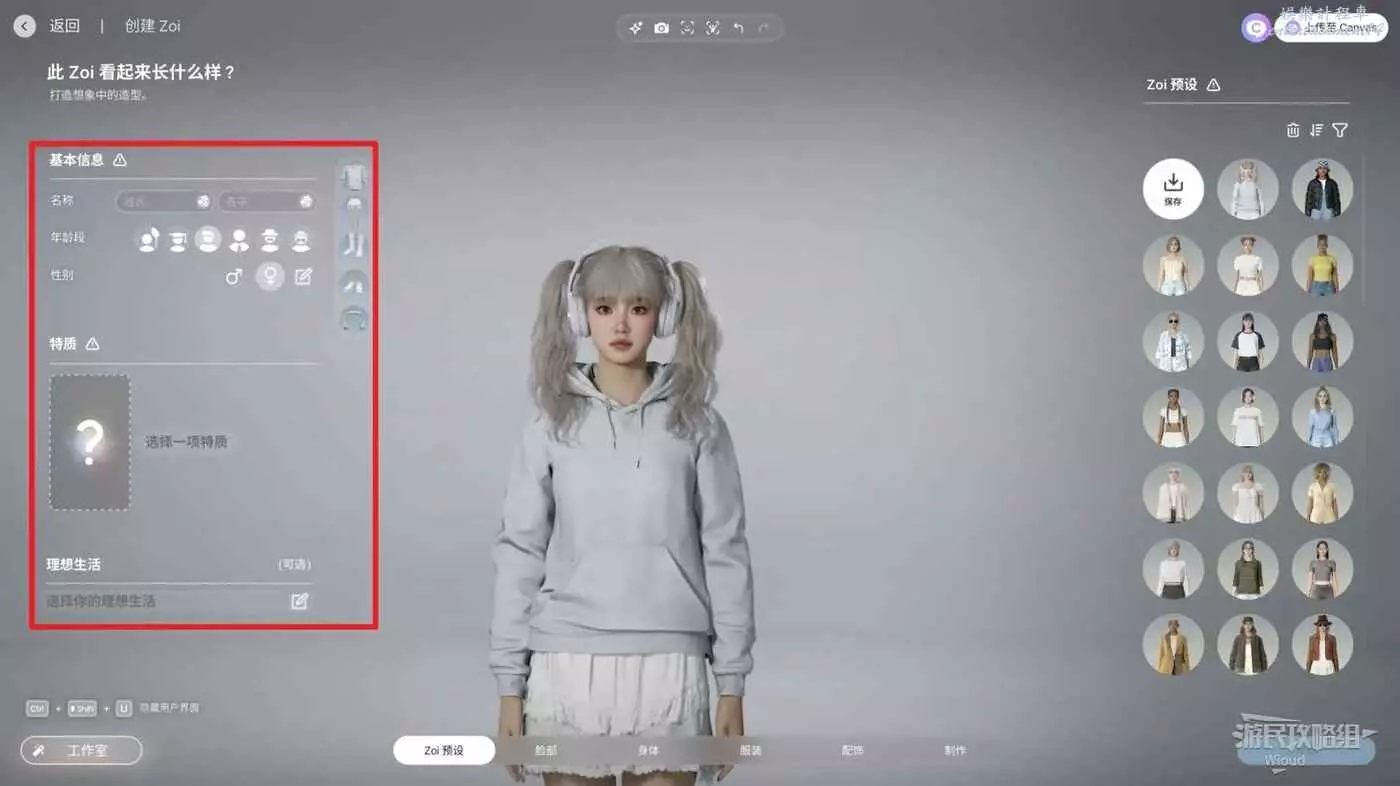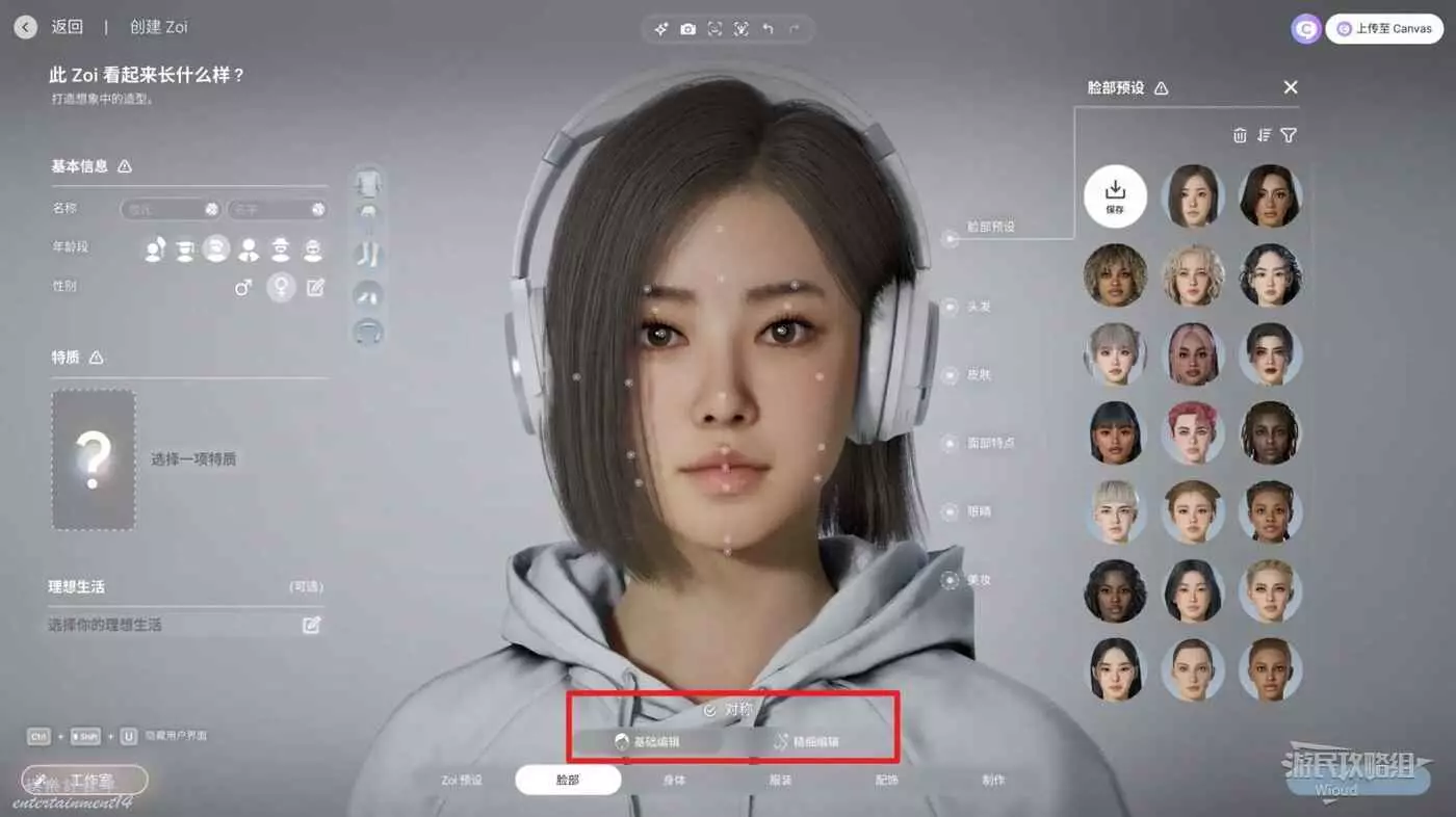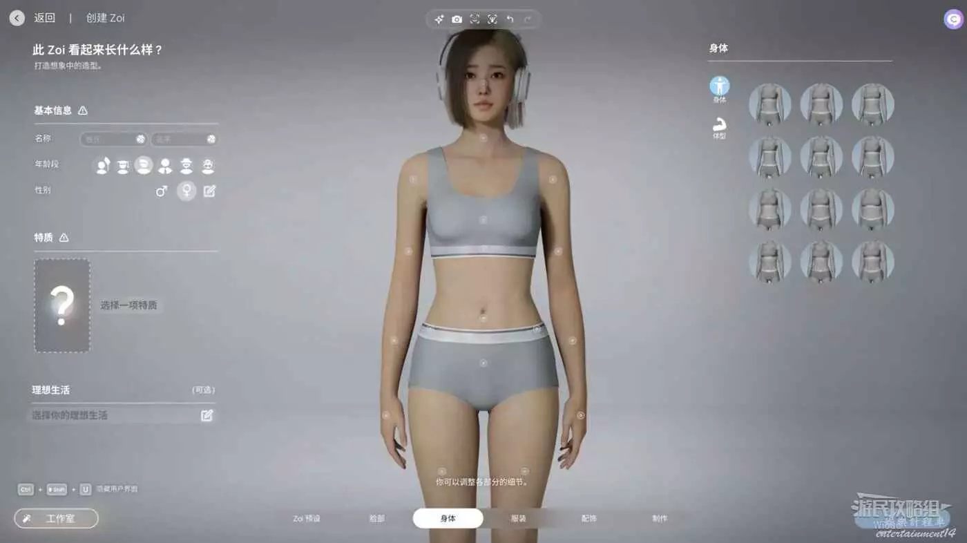 點擊新遊戲進入捏臉頁面,螢幕左側的基本資訊比較重要的是年齡段、性別與特質,這三個選項後期都無法更改。