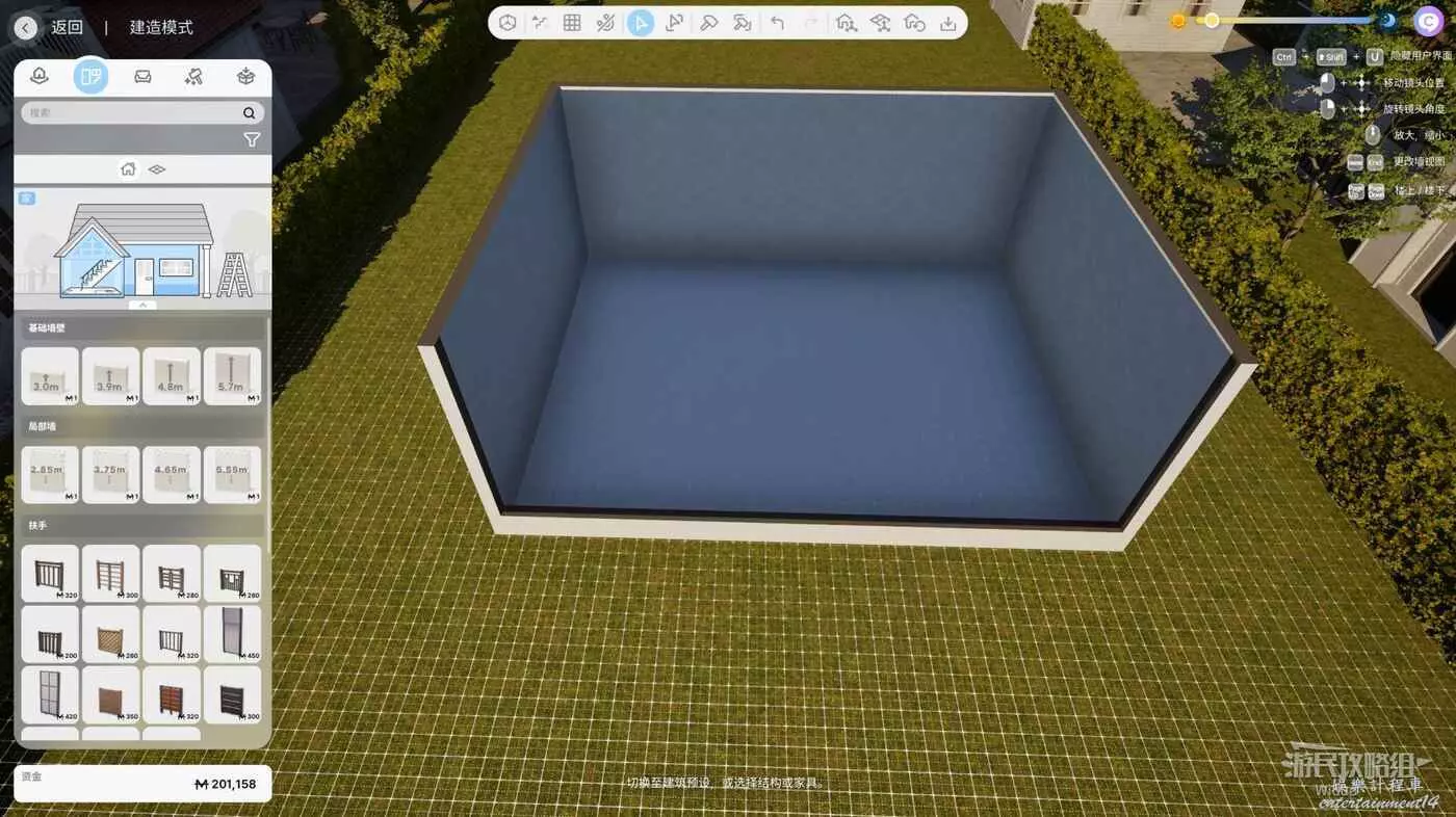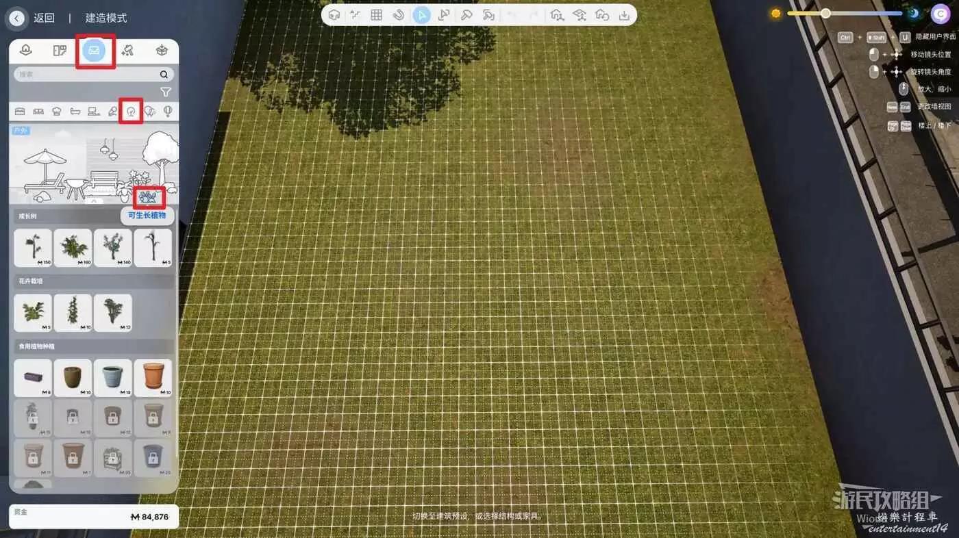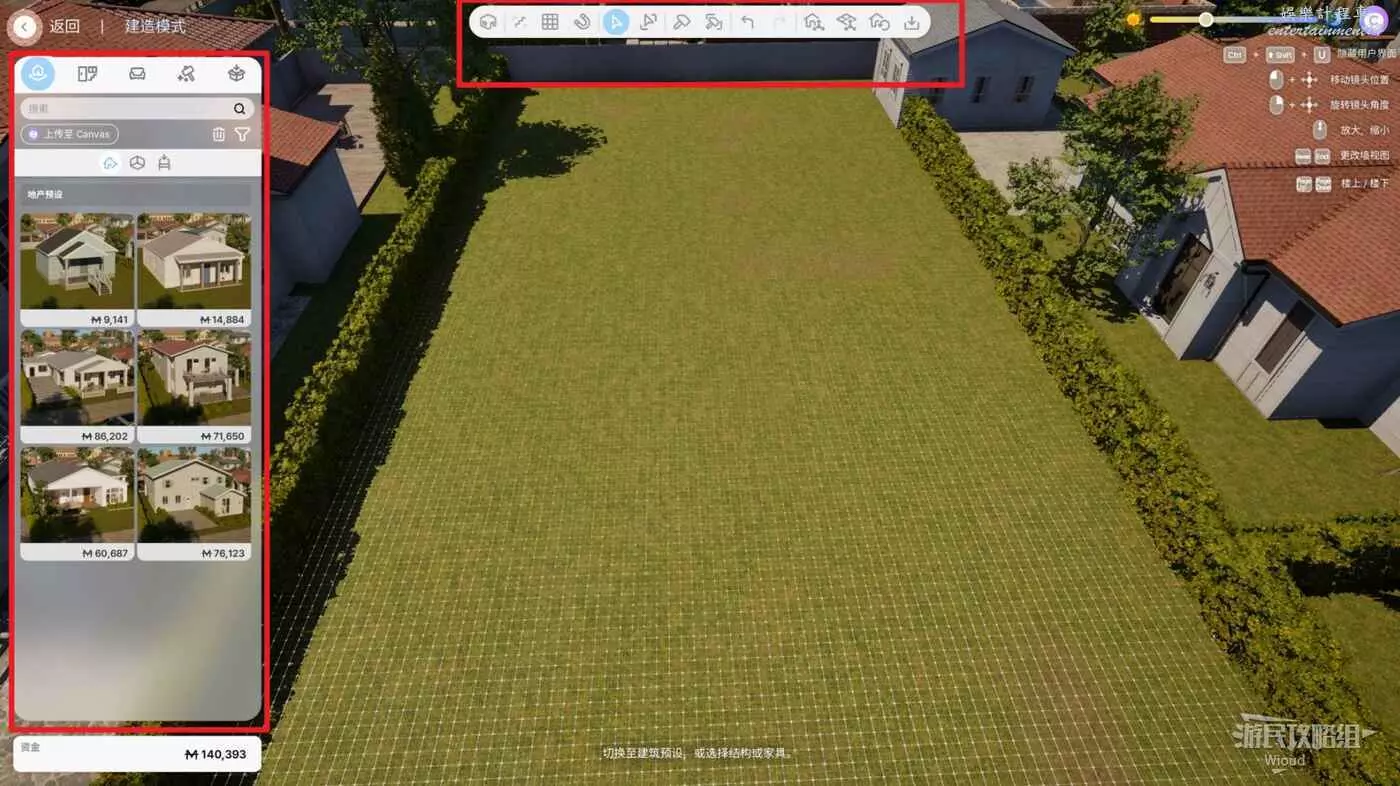 通過快速鍵【I】或者主頁面右下角的功能表進入建築模式,建築模式的初始狀態可以從中間網格地塊看到地塊範圍,左側是房屋的外牆、建築等功能表,螢幕上方是建築模式的工具功能表,右側可以看到建築模式需要用到的快速鍵,右上角的進度條可以選擇當前狀態是白天還是夜晚。