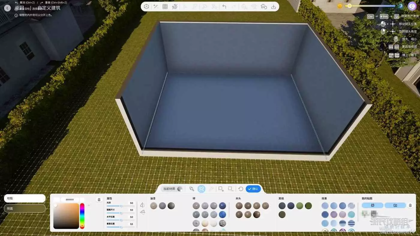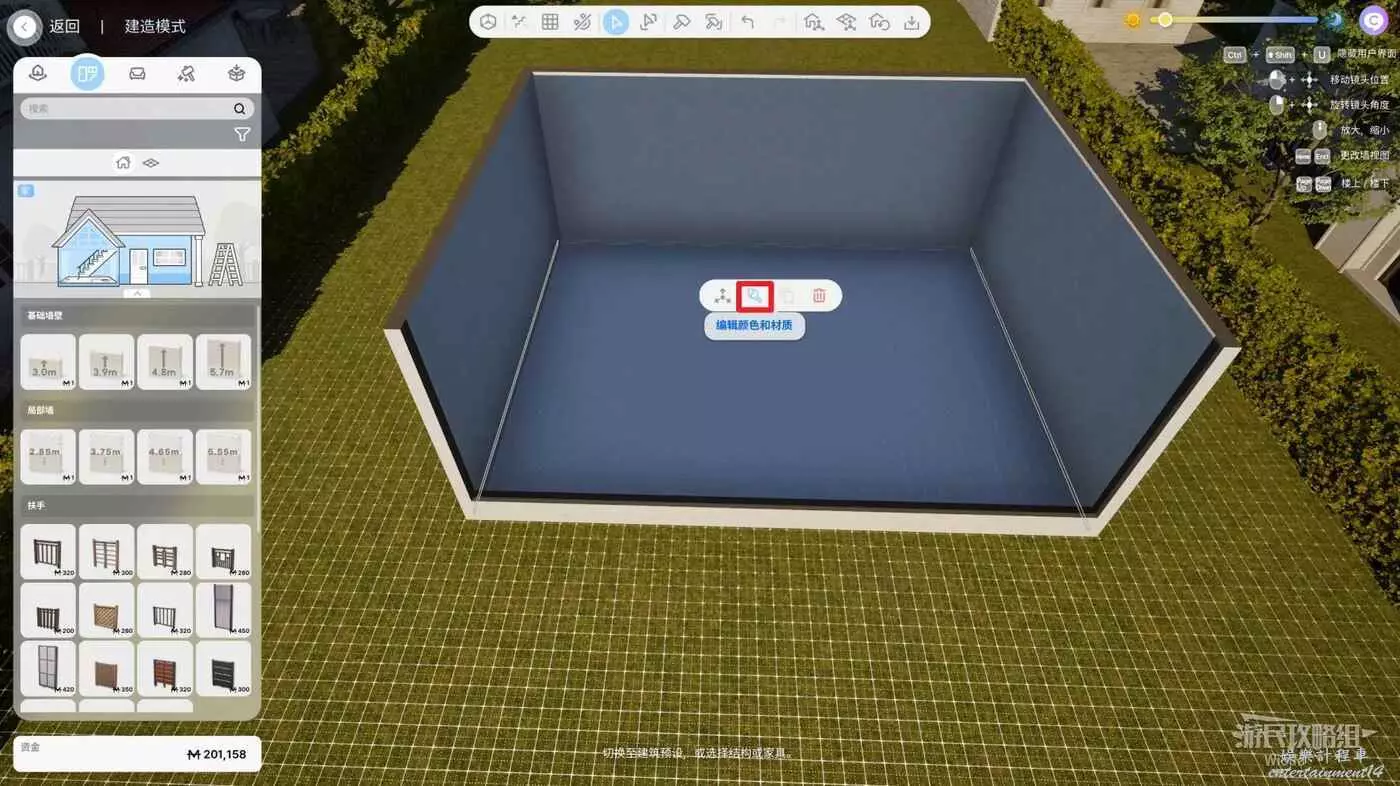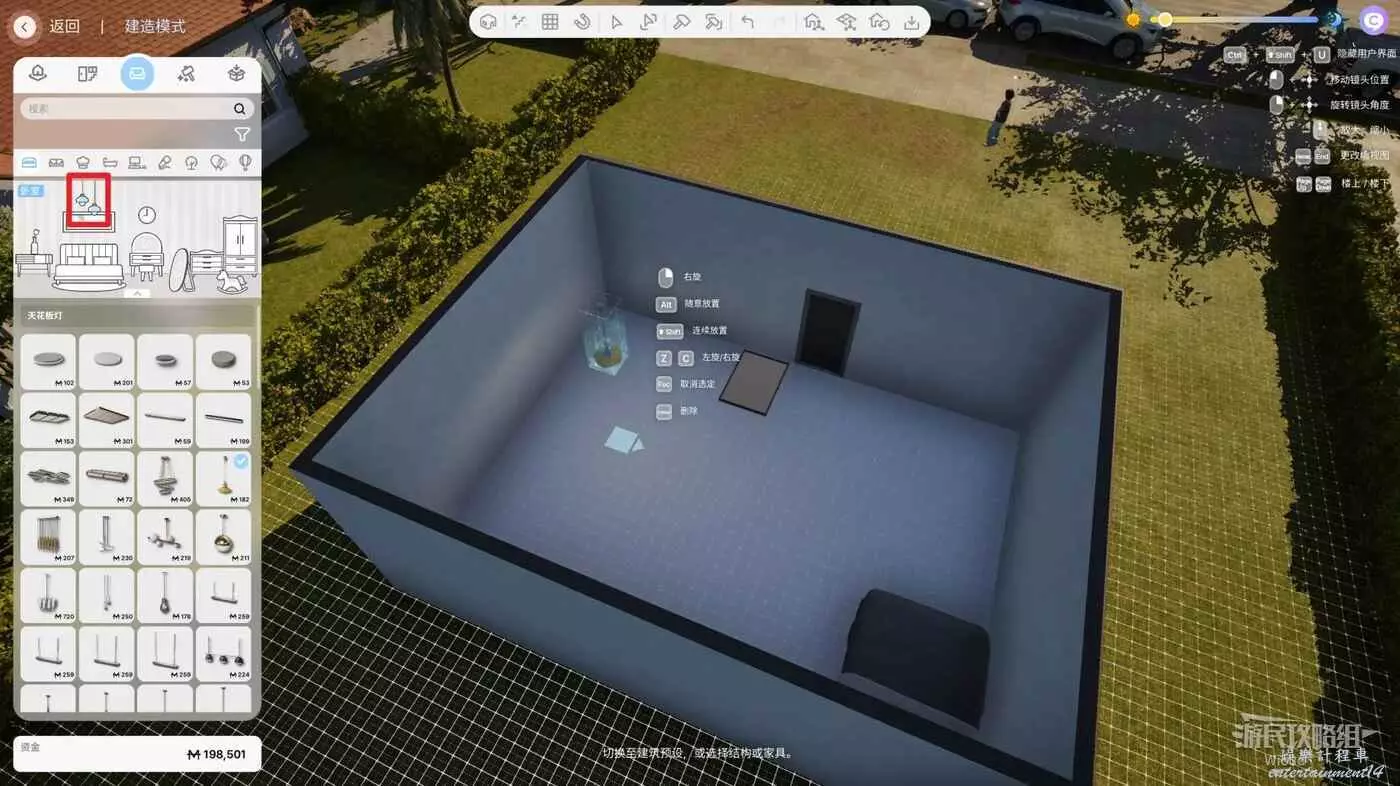 通過快速鍵【I】或者主頁面右下角的功能表進入建築模式,建築模式的初始狀態可以從中間網格地塊看到地塊範圍,左側是房屋的外牆、建築等功能表,螢幕上方是建築模式的工具功能表,右側可以看到建築模式需要用到的快速鍵,右上角的進度條可以選擇當前狀態是白天還是夜晚。