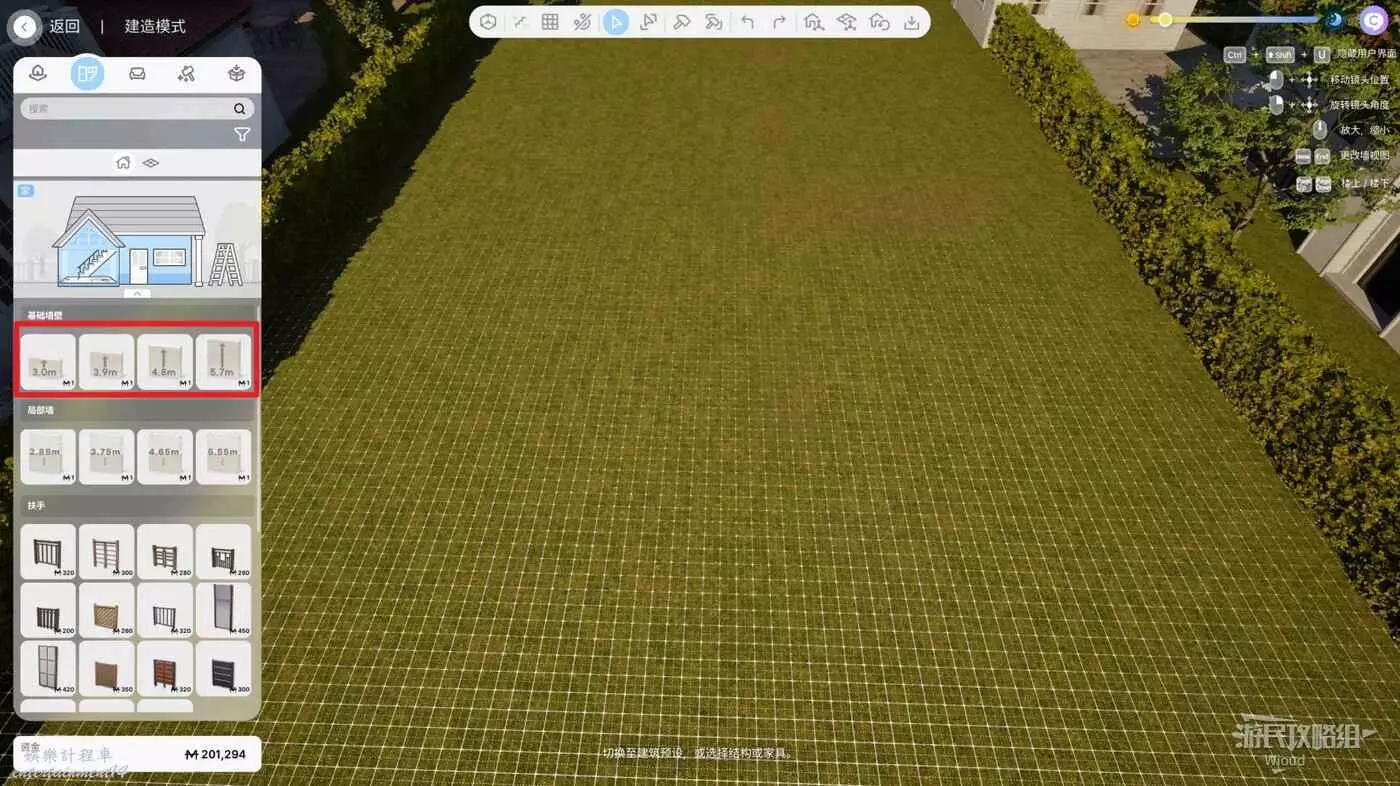 將游標移動到中間房屋的牆壁位置選定,在基礎牆壁一覽任意選擇一種高度的牆壁。