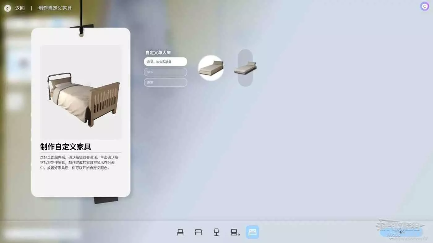 其他傢俱的放置流程也是完全一樣的,本作對房間的類型沒有限制,你可以在床的旁邊放一個馬桶,看懂原理後,剩下的就可以自由發揮了,對於懶人玩家可以直接選擇下頁的【快速建造房子】。