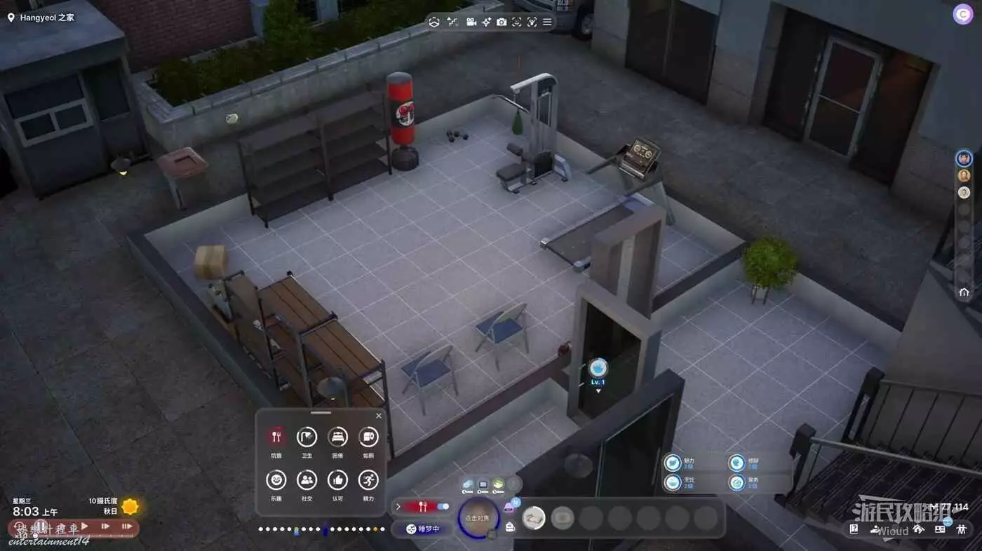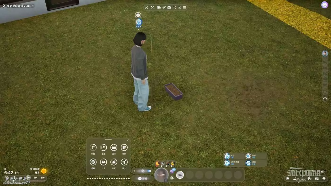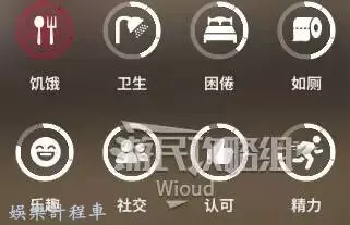 2、左側兩個橢圓圖示上面的藍色開關代表小人的自主控制項開啟或關閉,下面顯示當前小人的情緒狀態,右側上面帶有時間軸的圖示代表小人期待的行為,下面對焦小人圖示右側可打開手機與背包,空白的圓形圖示會顯示小人正在做的行為與進度。