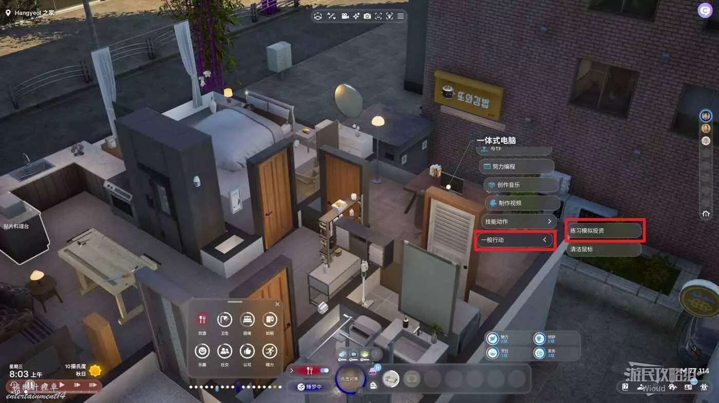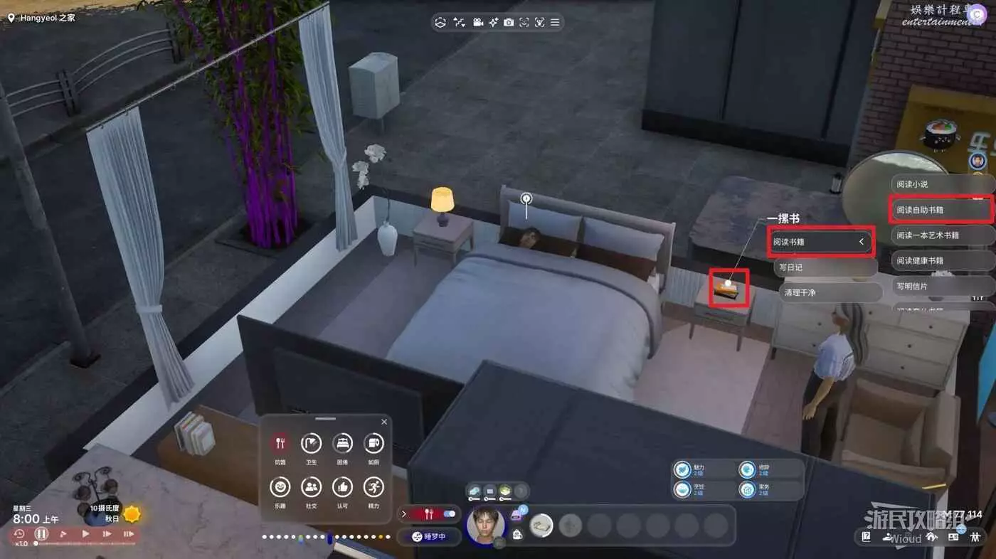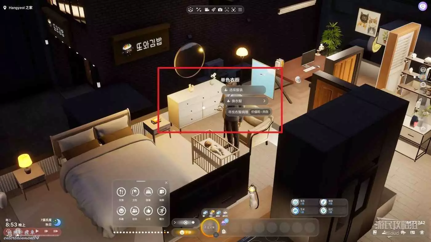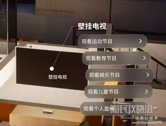 【滑鼠左鍵】按一下場景中可互動的傢俱彈出互動選項,左鍵按一下選項開始對應的選項動作。