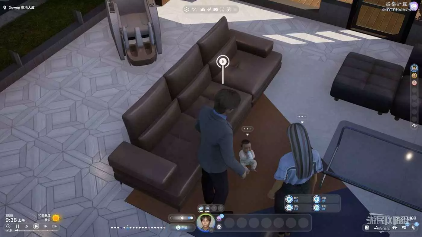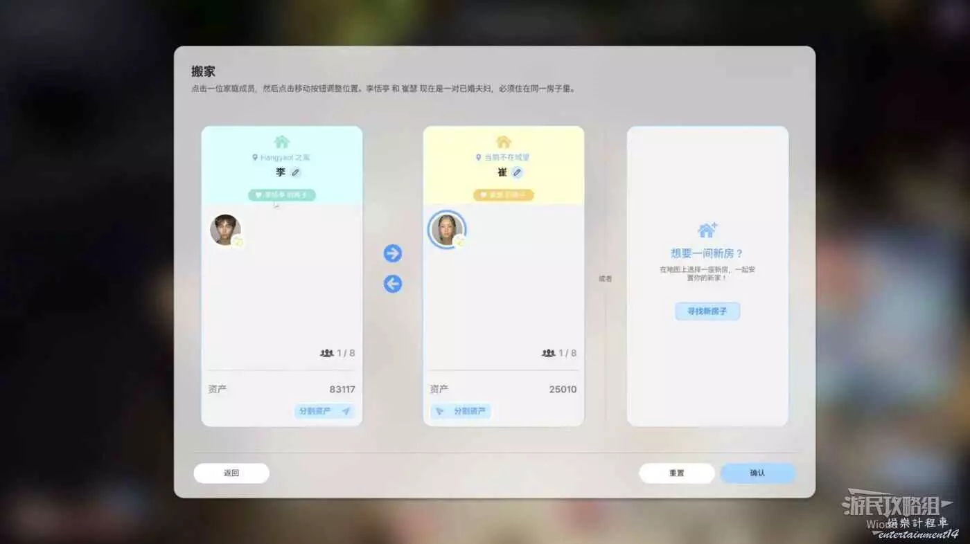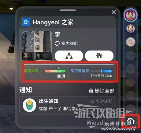 4、右側的小人頭像代表這個家庭的小人數量,點擊圖示可以切換操作的小人,點擊下面的房屋+!圖示,可以看到目前居住的地塊名稱與房子的清潔度,還能看到家庭的族譜並增加新成員。