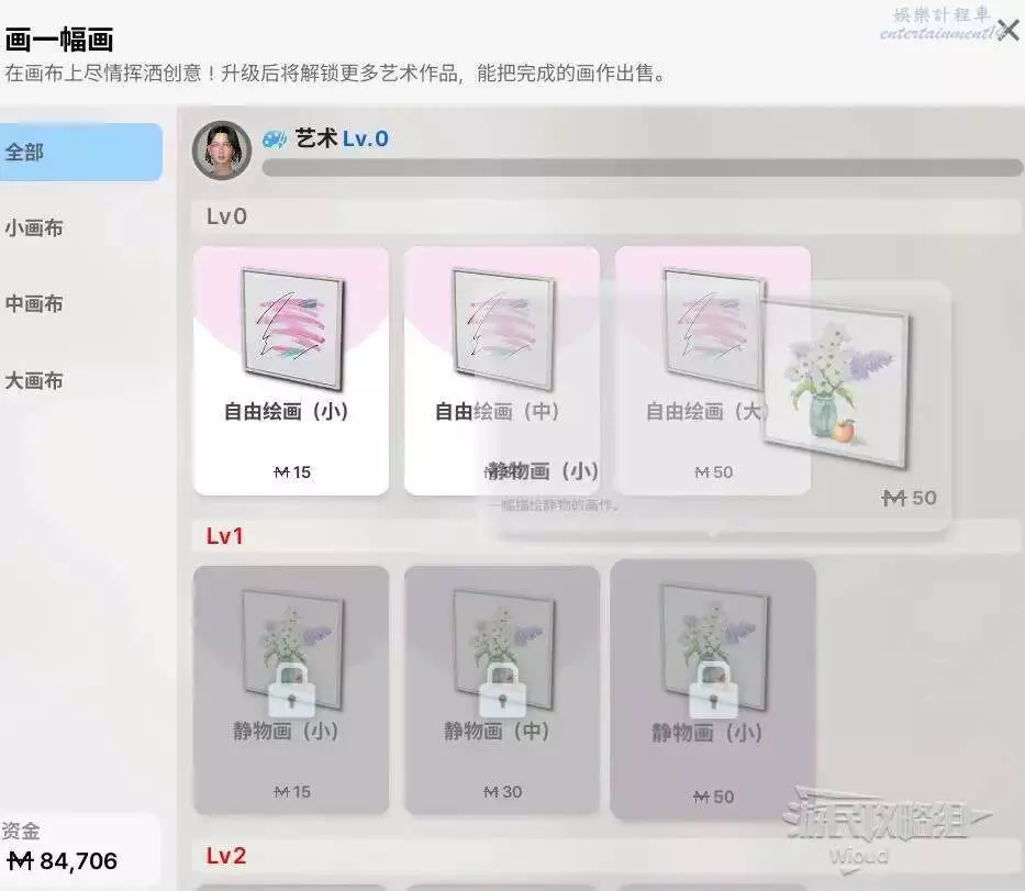 與媒體制作相同,畫畫也有相應的等級限制,只有提高小人的藝術等級才能解鎖一些特定類型的畫作。