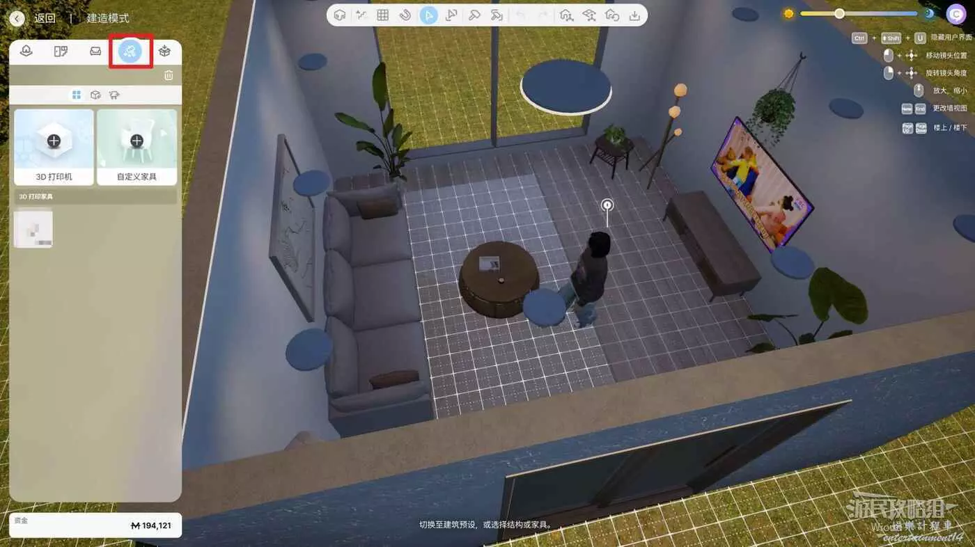 建造模式,點擊左側功能表第四個選項可以找到3D印表機與自訂傢俱的入口。