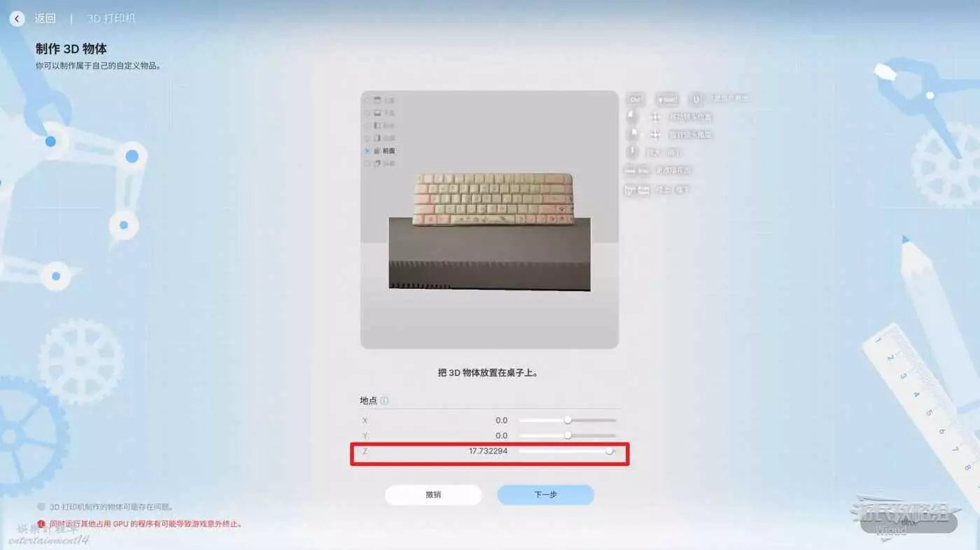 繼續調整Z軸將物體移動到桌子上方,點擊下一步。
