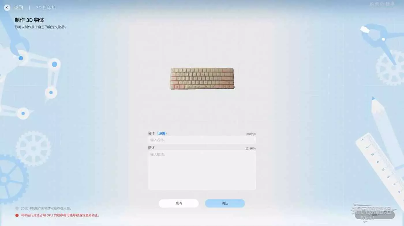 為你生成的物體取名和簡介,完成這個物體的上傳,此時這個傢俱將會出現在剛才的選擇3D印表機下方,選擇傢俱放到世界中即可。