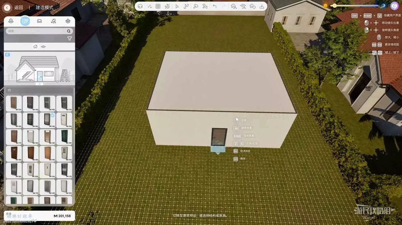 可以看到功能表選項卡中間出現一棟房屋,將滑鼠移動到房屋位置,可以發現游標可以自由選擇這個房屋圖示的任意部件,如【牆壁】、【門】、【窗戶】等。