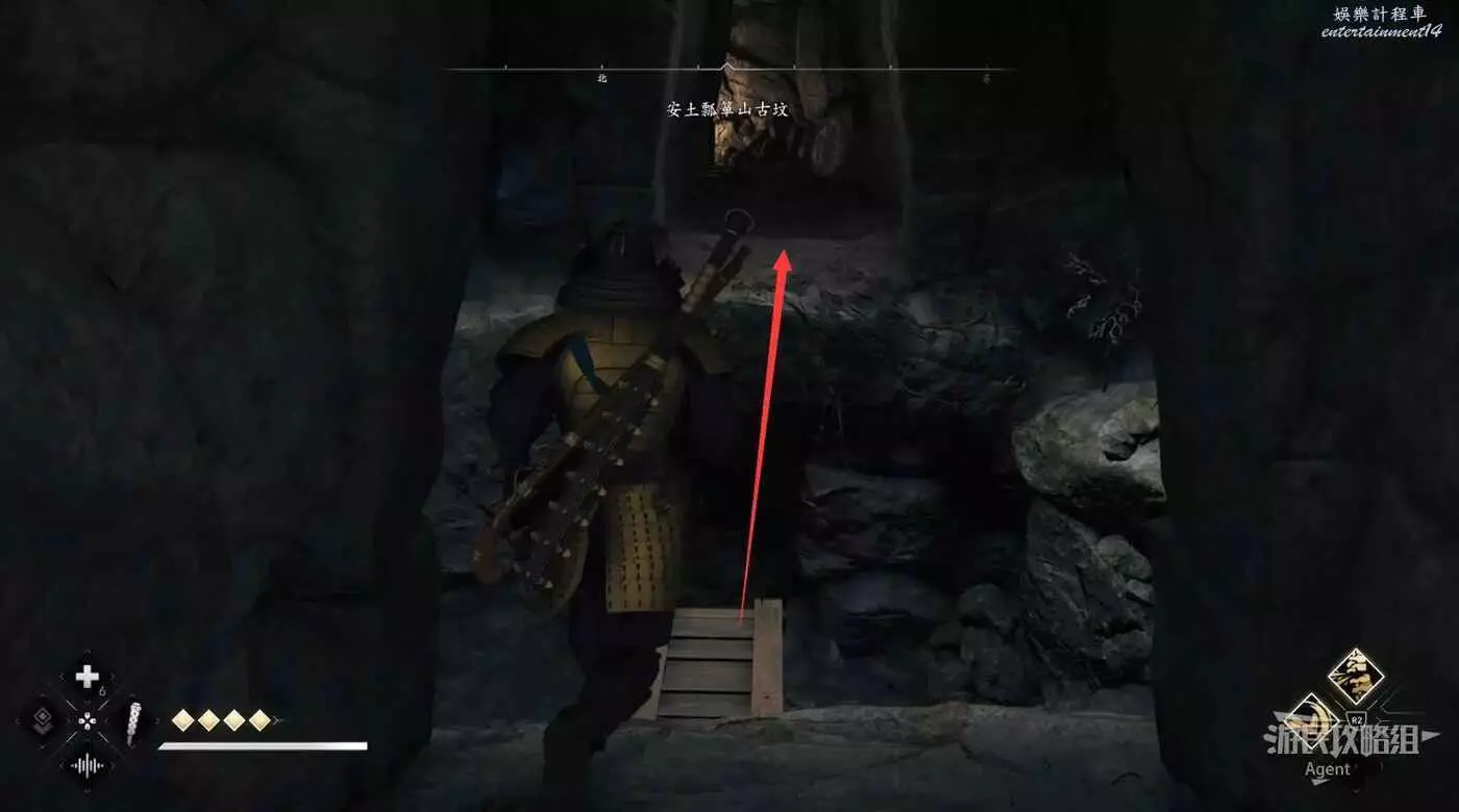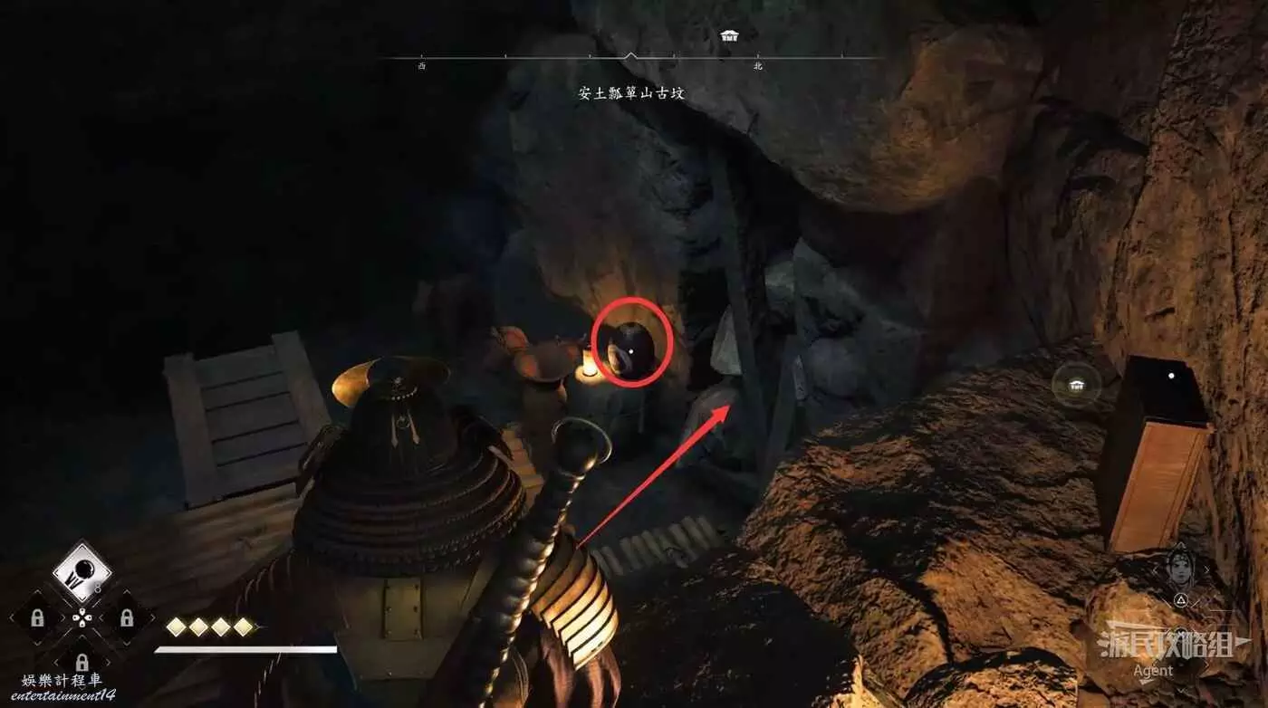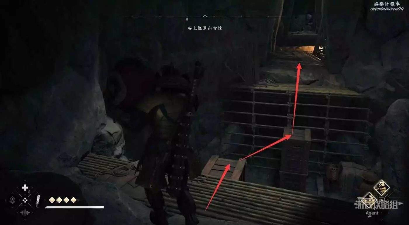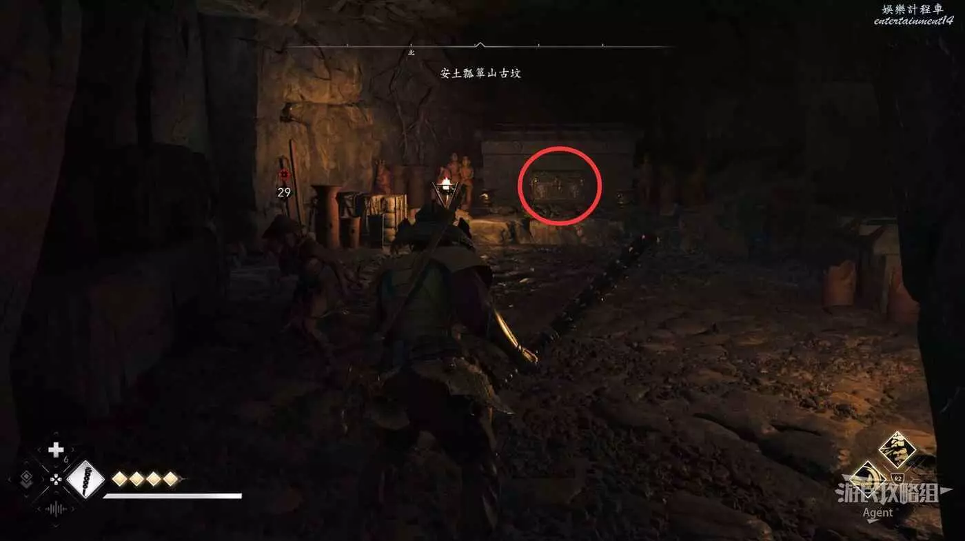 過來後先放下炸藥,射爆下面右側的炸藥,進去拿個小寶箱。