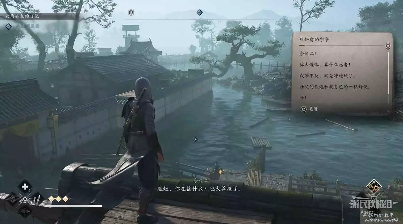 刺客教條 暗影者 六角公主的日記支線任務攻略 29 3 月 2025-03-29 廣告 作者:Agent 來源:遊民星空 支線-六角公主的日記、上忍的枕邊書 到大溝城幫勝姬偷火槍,結果她等不及先進去了。 迅速趕過去救勝姬。 解決城門附近的敵人,然後把勝姬背到城門。 救了勝姬後,勝姬終於願意加入,成為盟友。 然後到若狹北部找勝姬,觸發戀愛劇情。