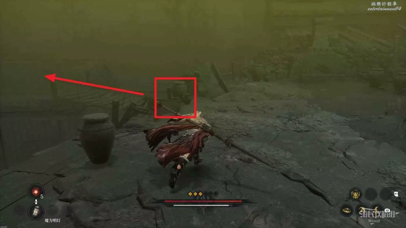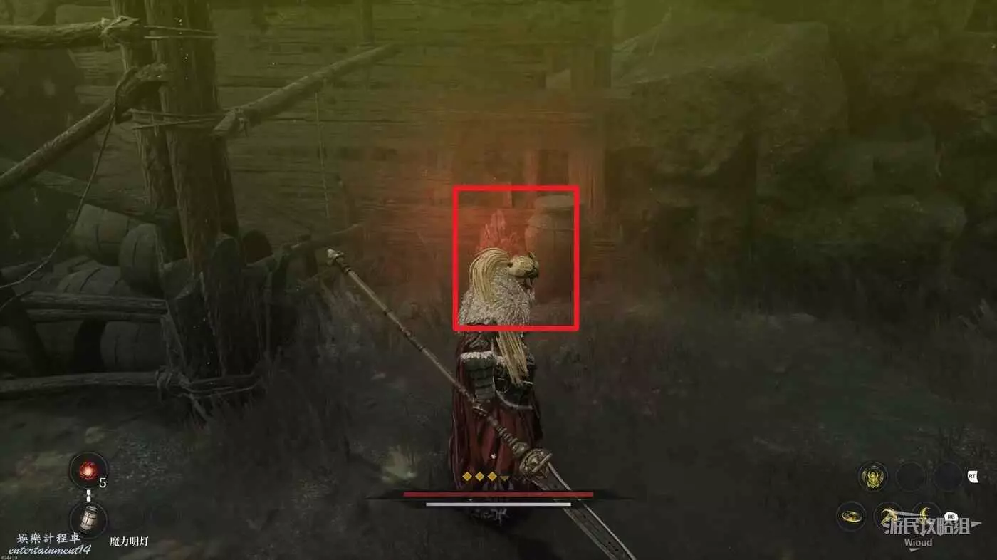 完事面對木門,右側可以看到一個木頭架子,架子右側藏著本地圖第二個【鬼石】。