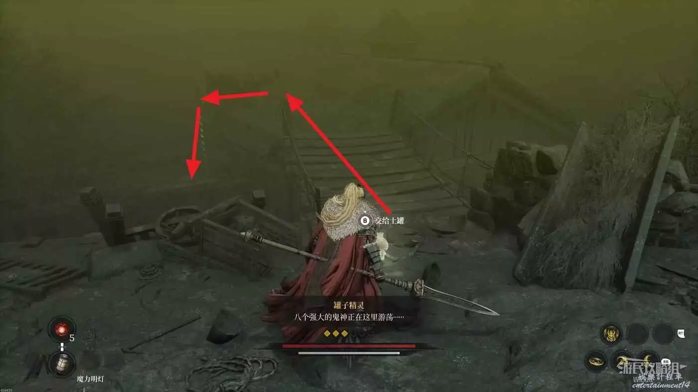 進入地圖先爬梯子,啟動前面第一個篝火,然後與罐子商人對話得知我們需要在這張地圖找到六個罐子精靈,而罐子精靈都躲在罐子裡,需要將罐子打破才能讓其顯形。