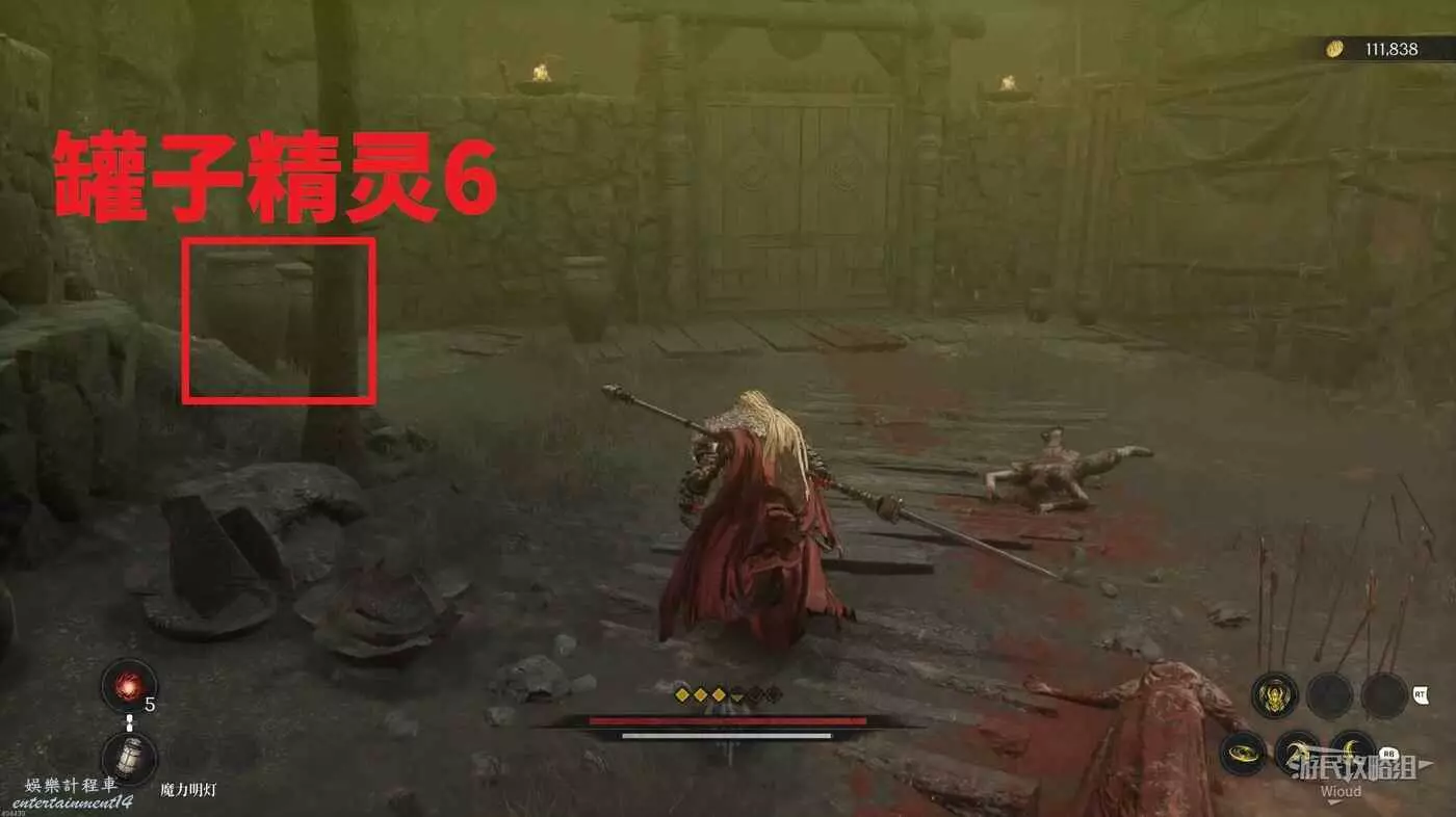 穿過拱門沿路走到盡頭關閉的木門處,木門左側紅框處的罐子可以找到最後一個罐子精靈。
