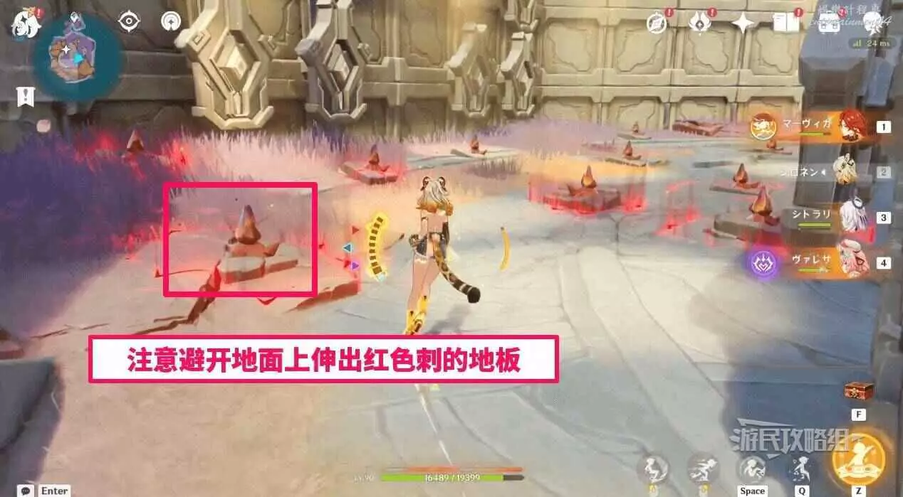 貼著最左邊的牆繞一大圈到最右邊,與機關互動即可完成迷宮。沒有其他的路,這是唯一的路,注意避開地上的紅刺和牆體凸出的機關發出的游標攻擊。
