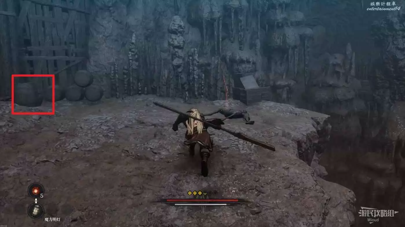 屍體左側被幾個木桶擋住的罐子是本地圖的罐子精靈,將罐子破壞即可。