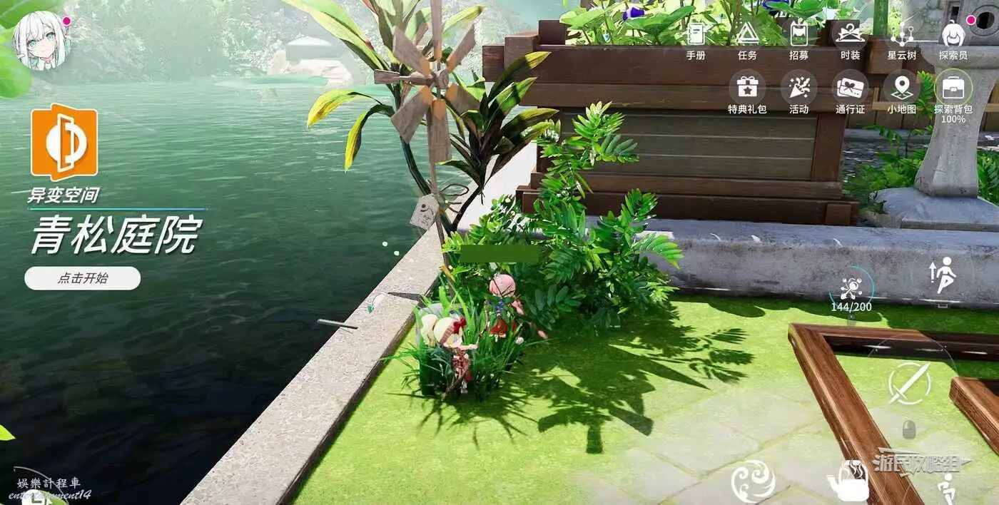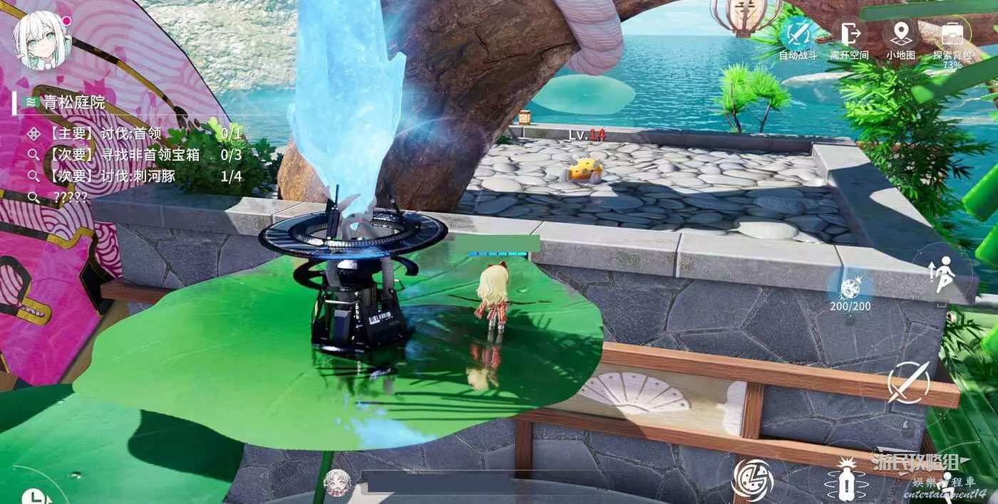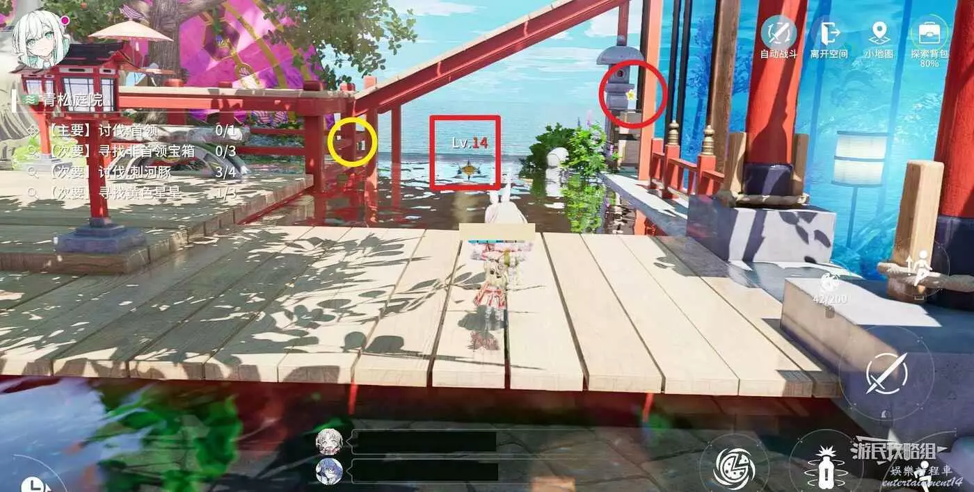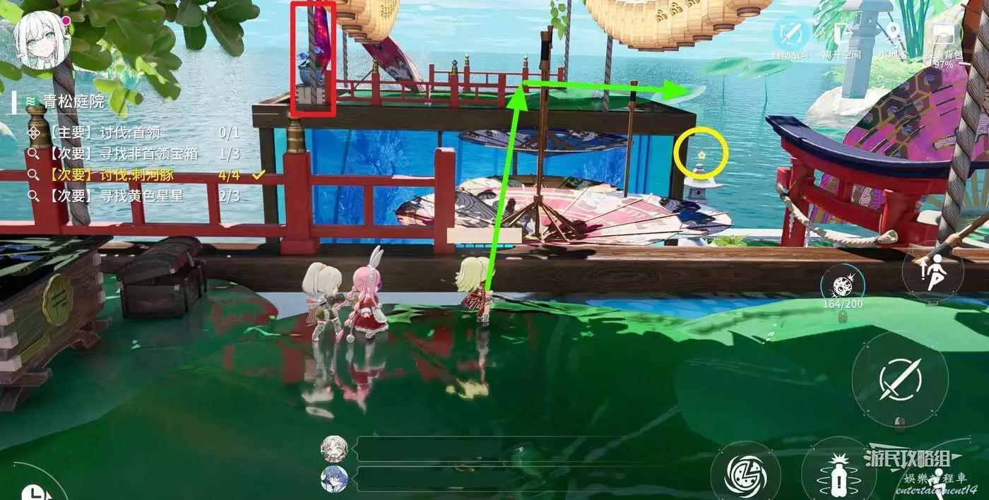 上台階到達第二層,視角往右側轉,可以看到旁邊高處水池裡的淨化石。跳荷葉將其淨化,然後跳上高處的台子。