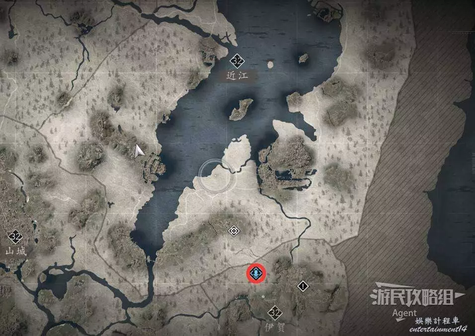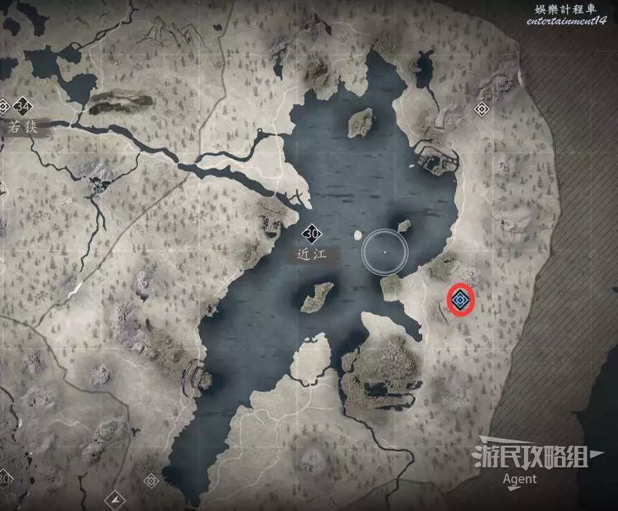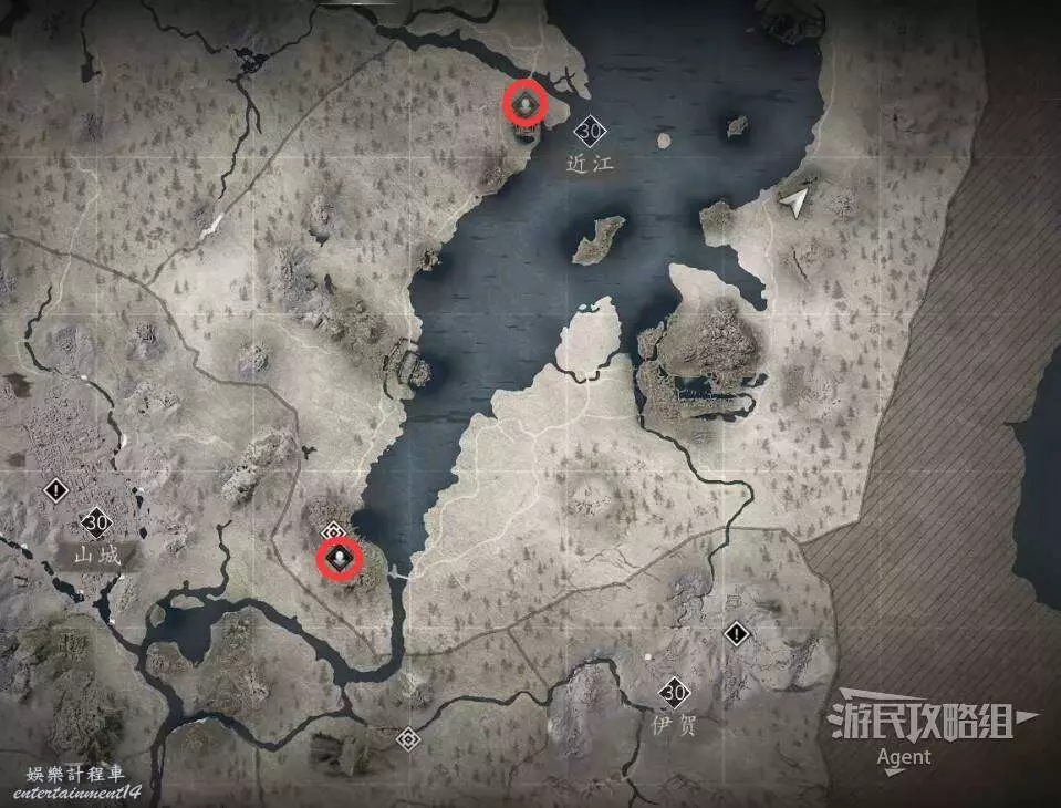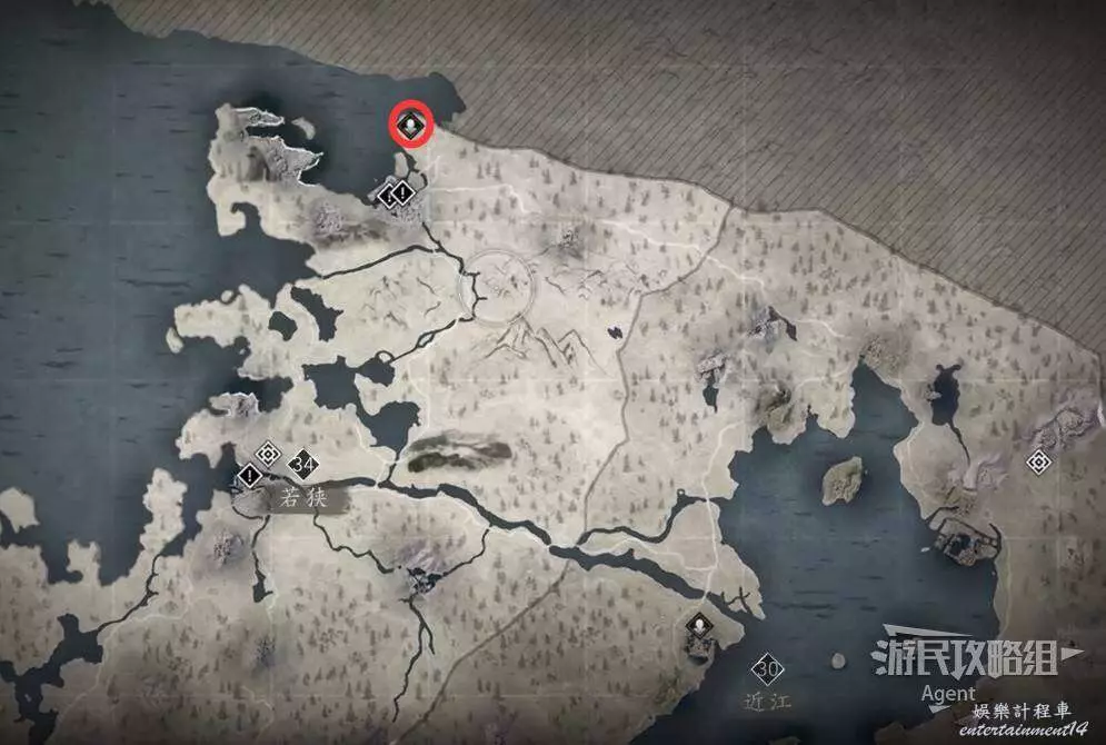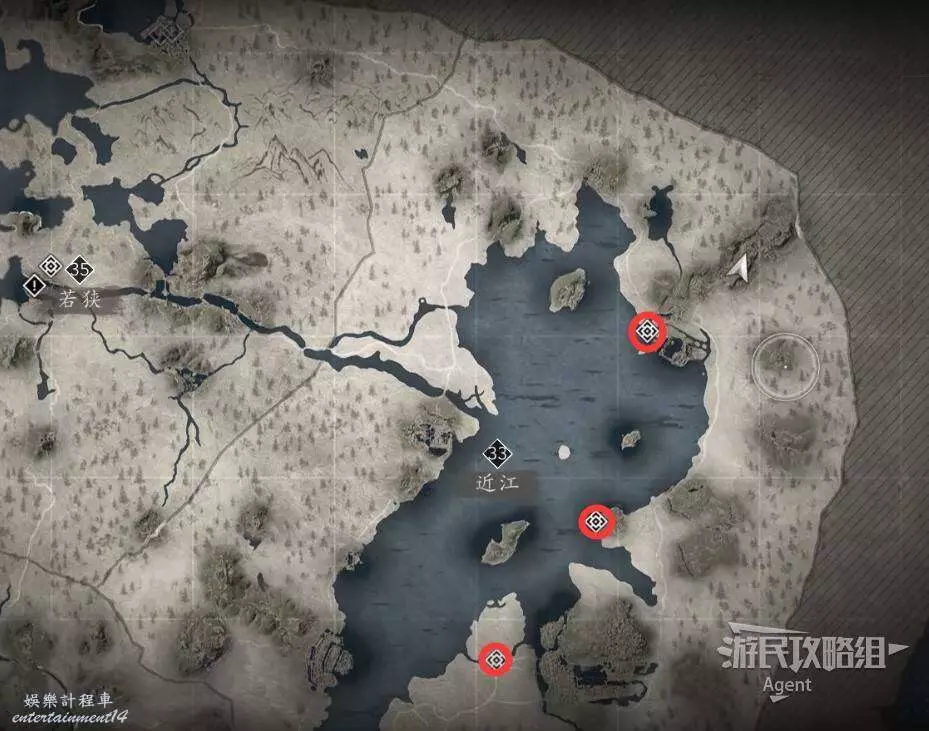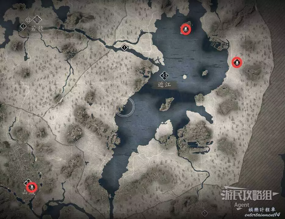 琵琶大師只會給你四個水賊的位置,如下圖。要想找到最後一個水賊,還需要去若狹北部的敦賀城,完成任務“甜蜜的謊言”。