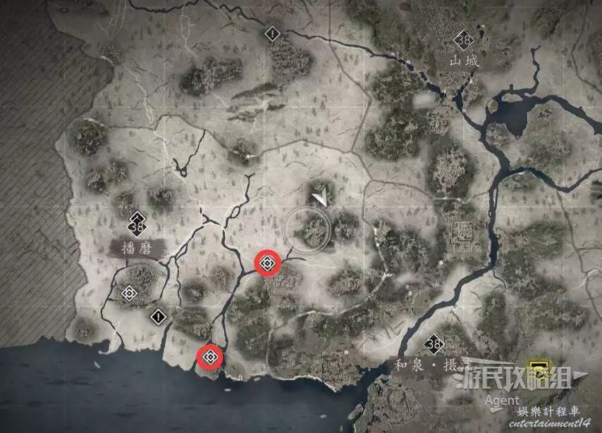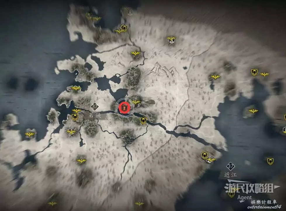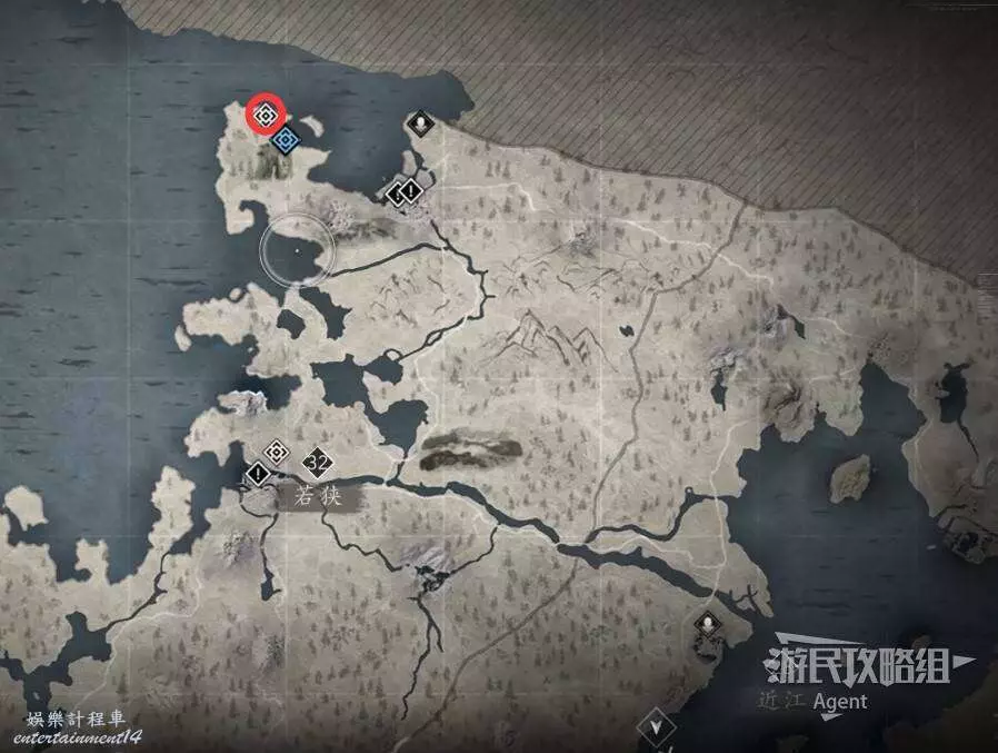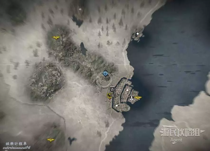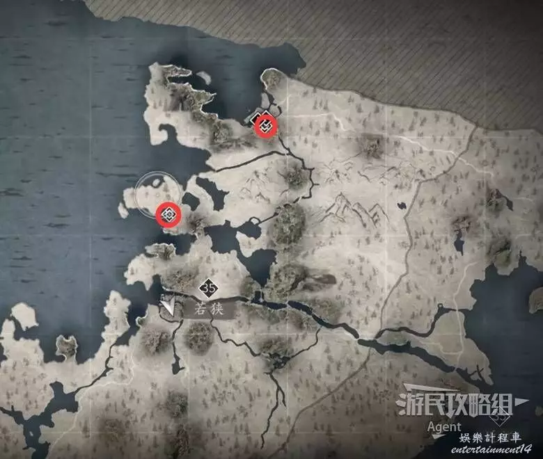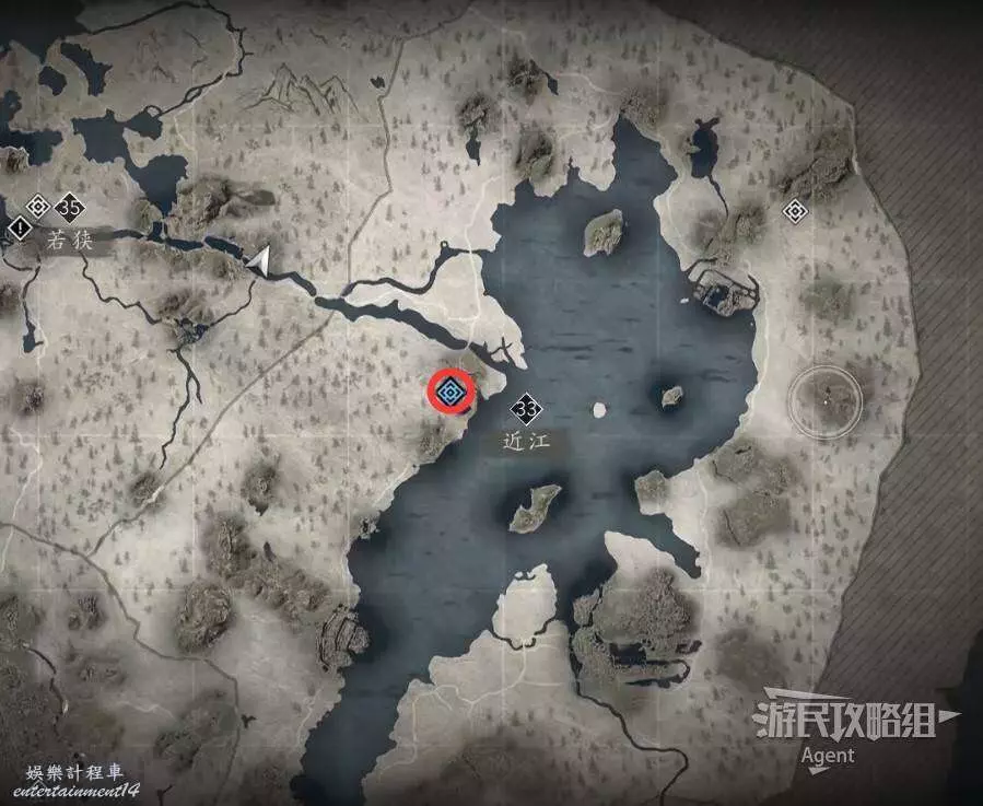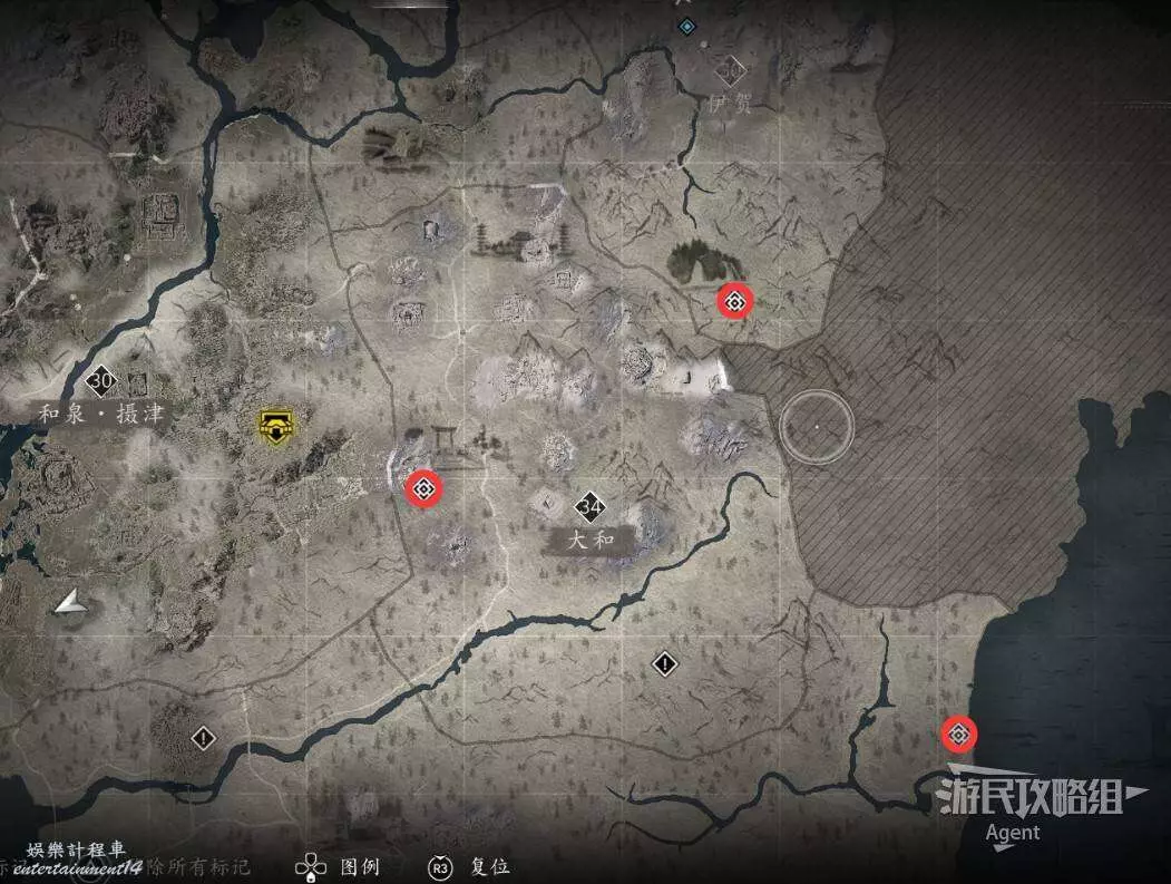 琵琶大師只會給你四個水賊的位置,如下圖。要想找到最後一個水賊,還需要去若狹北部的敦賀城,完成任務“甜蜜的謊言”。
