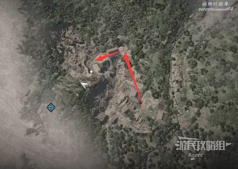 左邊的路被石頭擋著,從右邊上去有個洞口,通過洞口射爆炸藥,被石頭擋著的路就被炸開了。