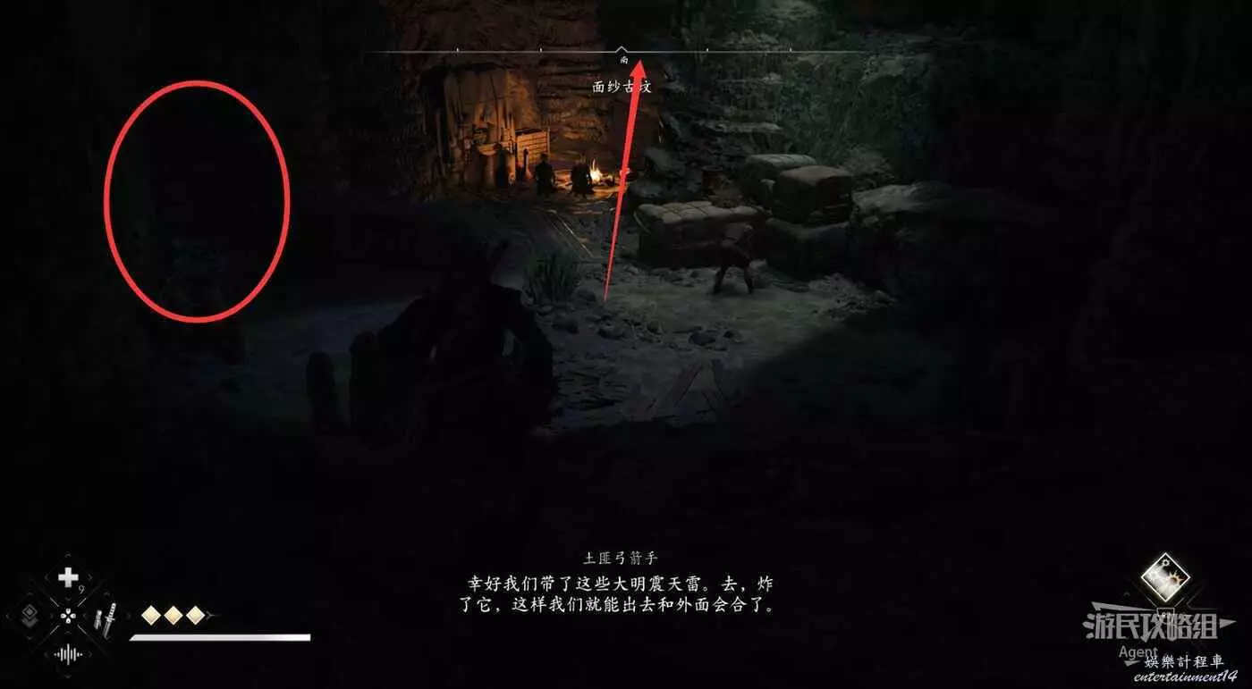 先炸開對面高處的路,進去拿個小寶箱,然後再射爆旁邊的炸藥就能出來,出來後,面前的剛好就是接下來要走的主要路線。