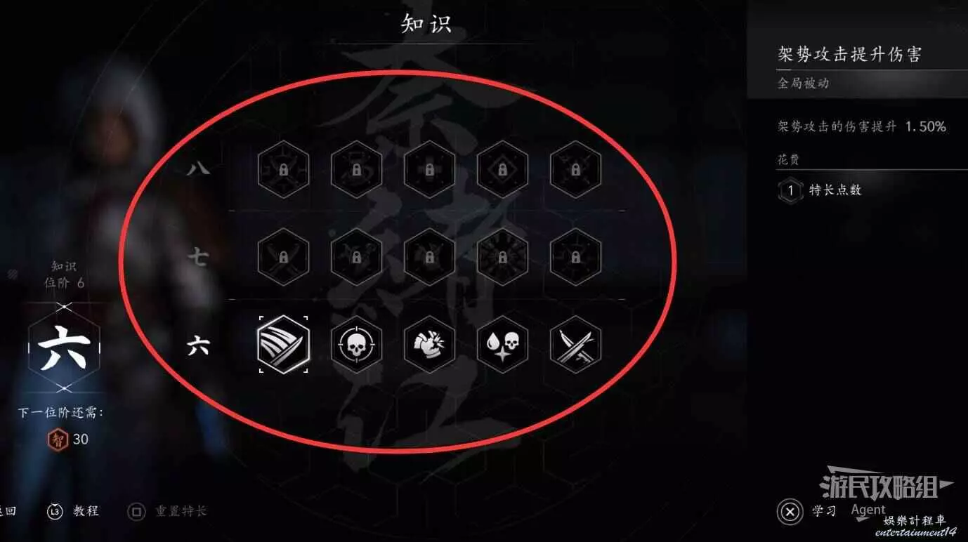 點擊下圖圈出的“六”就能看到知識路徑,多出來的技能點就可以用在這裡,以提升各種屬性增強能力。