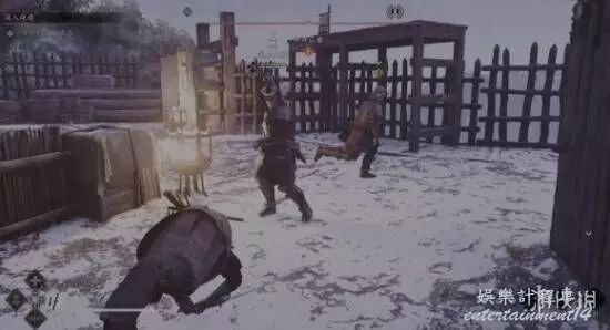 動畫結束向前走,刺殺面前的兩個敵人,爬上腳手架到下一個平臺。